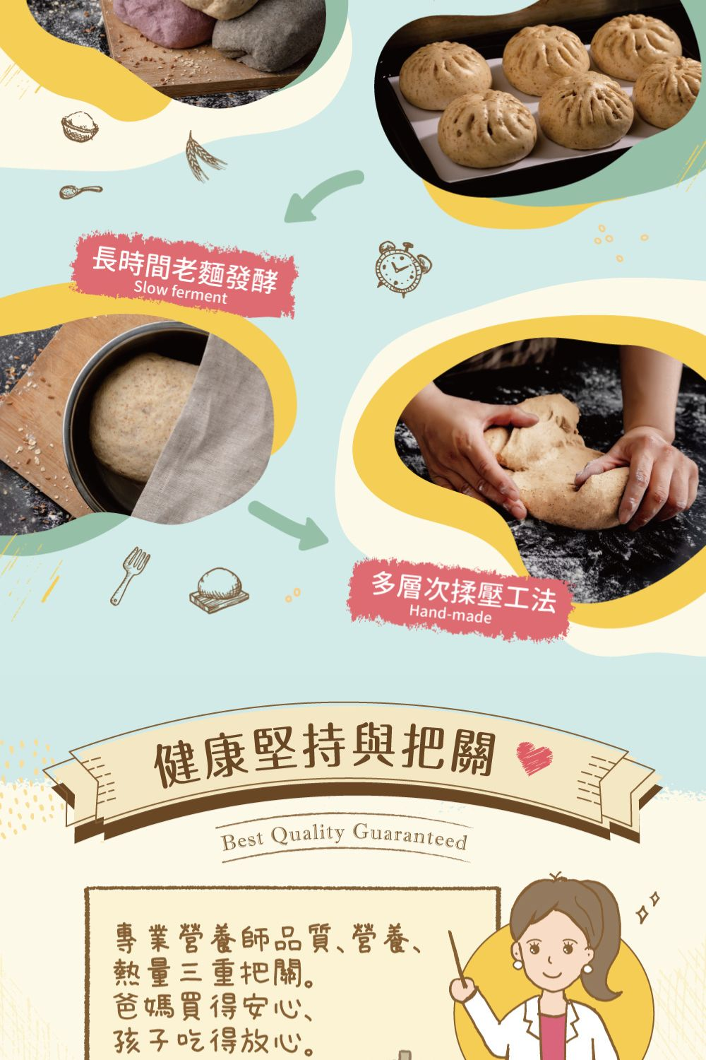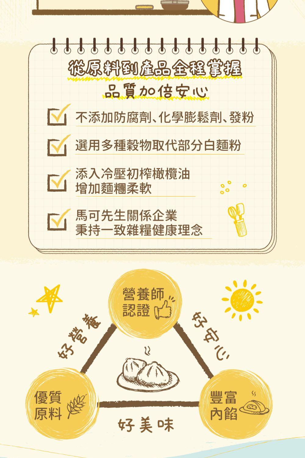 ★多層次壓麵工法、高壓保濕蒸炊機、IQF急速冷凍技術,鎖住水份保持口感,這樣繁複的工序,讓包子不用蒸炊,退冰後麵皮還保有Q彈口感