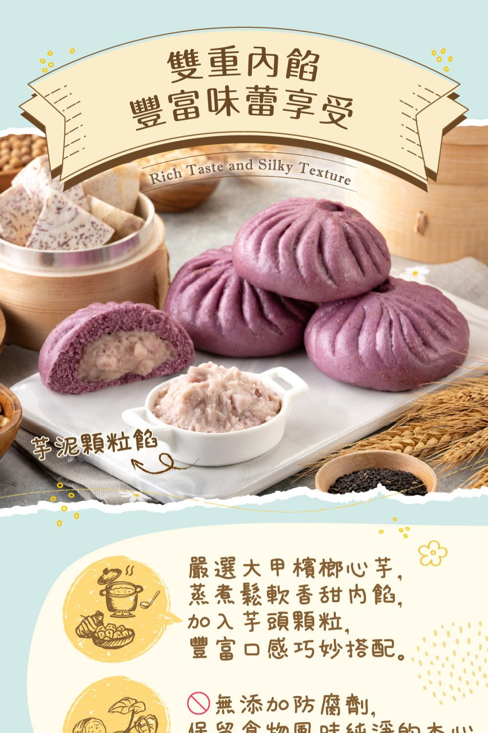 使用大甲檳榔心芋,12小時內新鮮製餡,蒸煮鬆軟香甜內餡,融入芋頭顆粒,芋泥香與綿密芋頭顆粒巧妙搭配,多層次口感,甜而不膩。