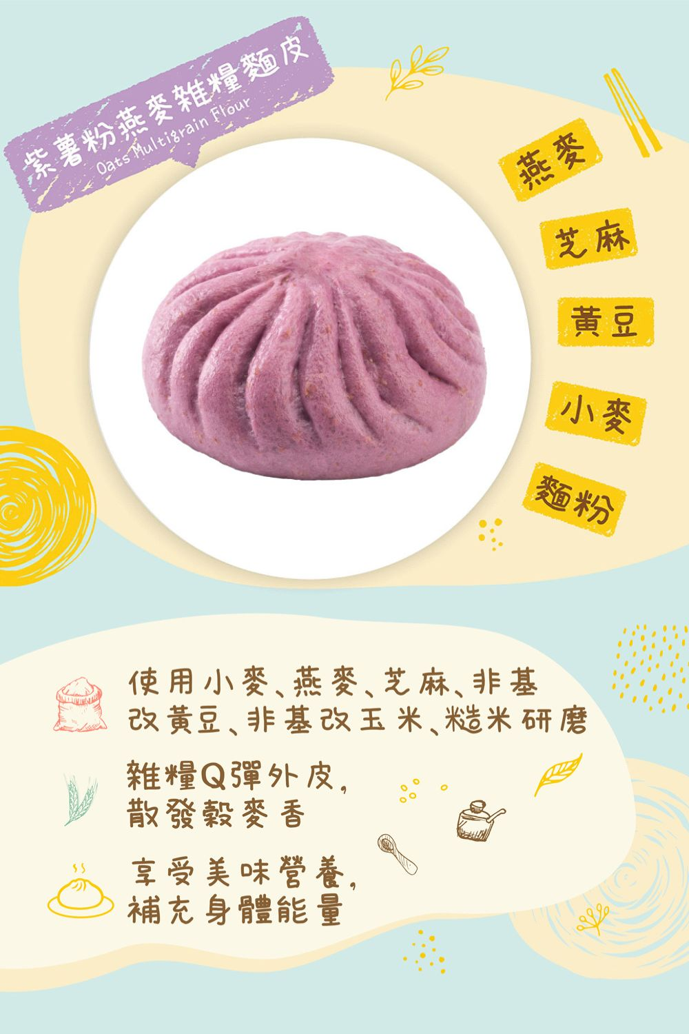 商品麵皮:天然紫薯粉融入大麥燕麥