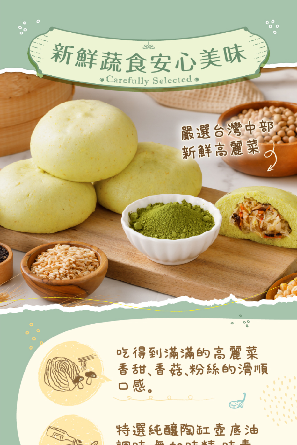 親愛的顧客您好~謝謝您的五星評價,【高麗菜菇菇包】將新鮮高麗菜、木耳、香菇、紅蘿蔔等切成細絲,創造多層次清脆爽口的甘甜風味,每一口都能吃到滿滿的蔬菜香甜味、香菇營養、粉絲滑順口感,簡單蔬食也能健康美味同時兼具。