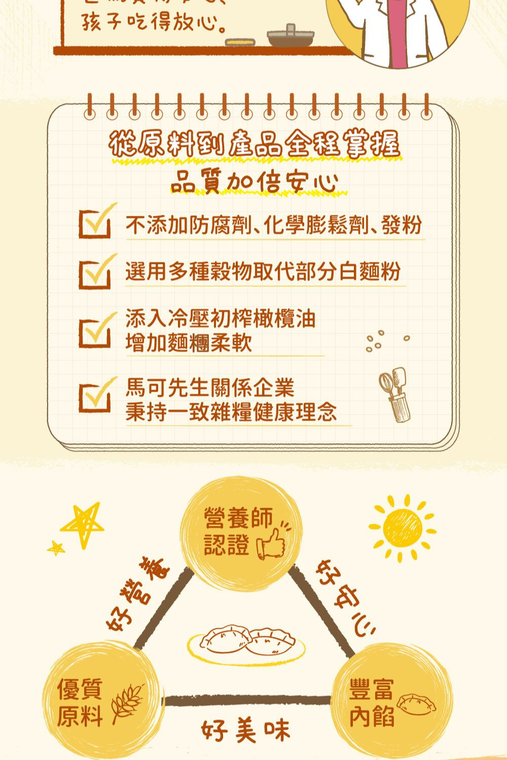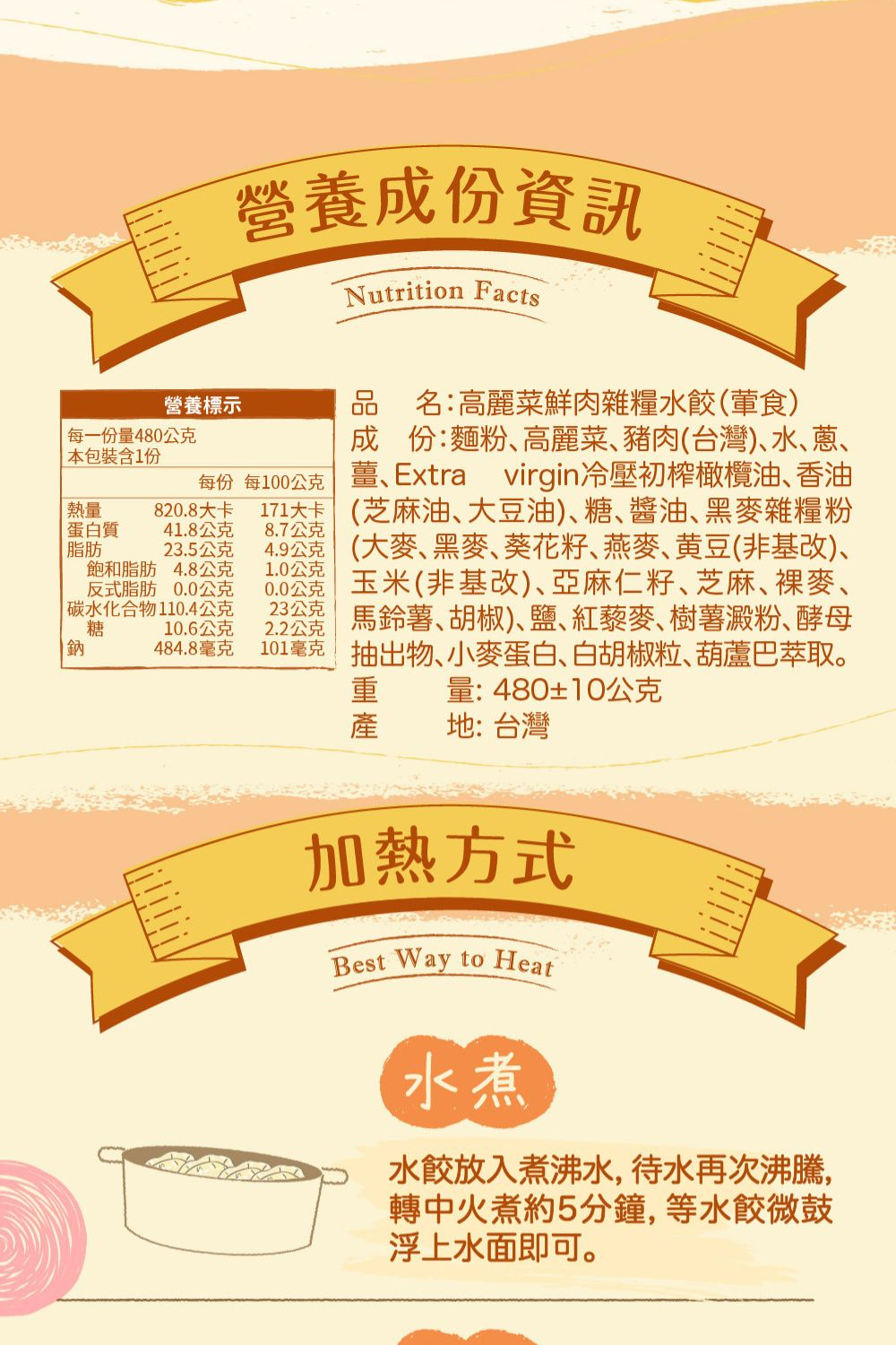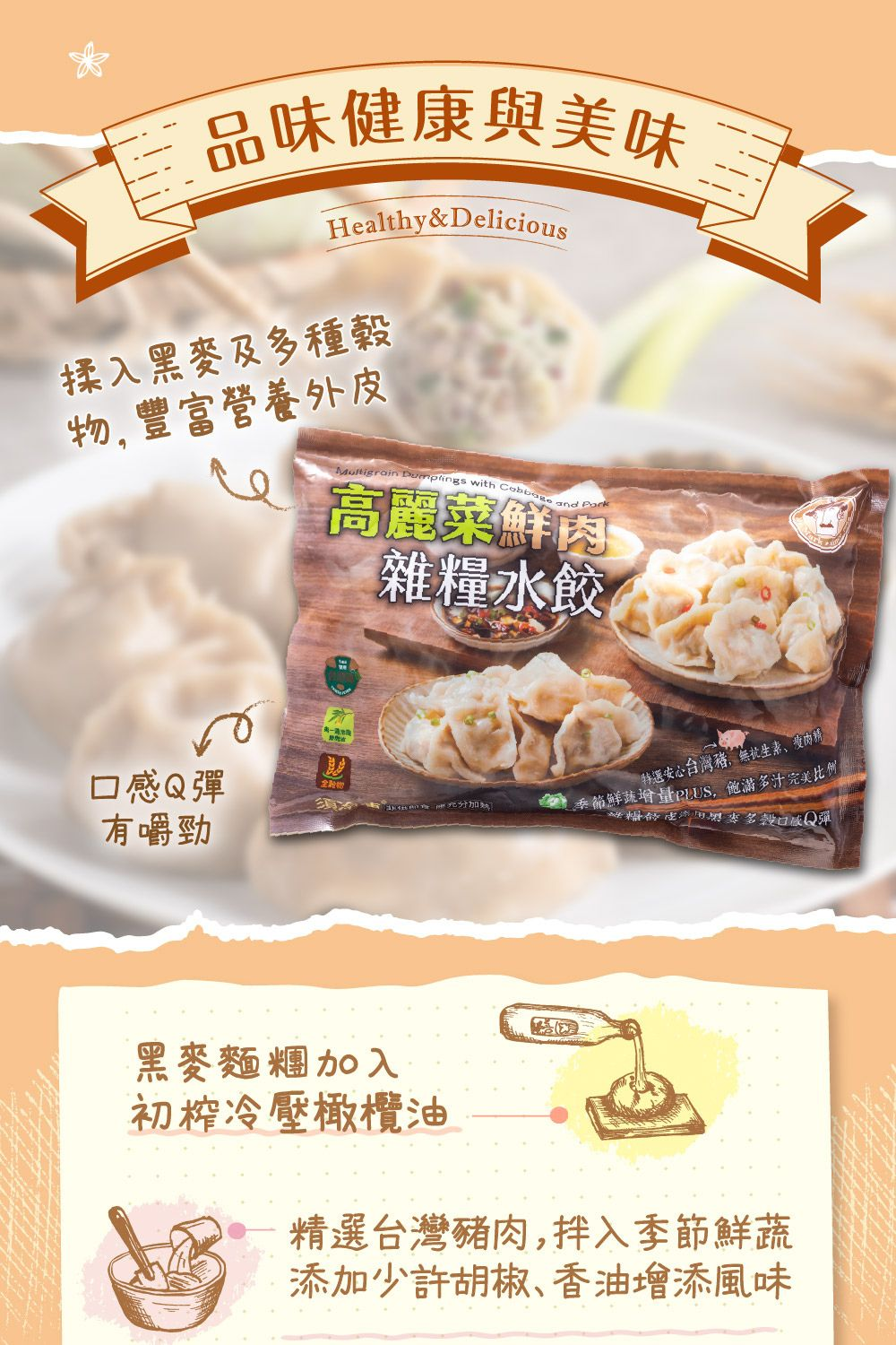 商品成分:麵粉、高麗菜、豬肉(台灣)、水、蔥、薑、Extra virgin冷壓初榨橄欖油、香油(芝麻油、大豆油)、糖、醬油、黑麥雜糧粉(大麥、黑麥、葵花籽、燕麥、黄豆(非基改)、玉米(非基改)、亞麻仁籽、芝麻、裸麥、馬鈴薯、胡椒)、鹽、紅藜麥、樹薯澱粉、酵母抽出物、小麥蛋白、白胡椒粒、葫蘆巴萃取。
