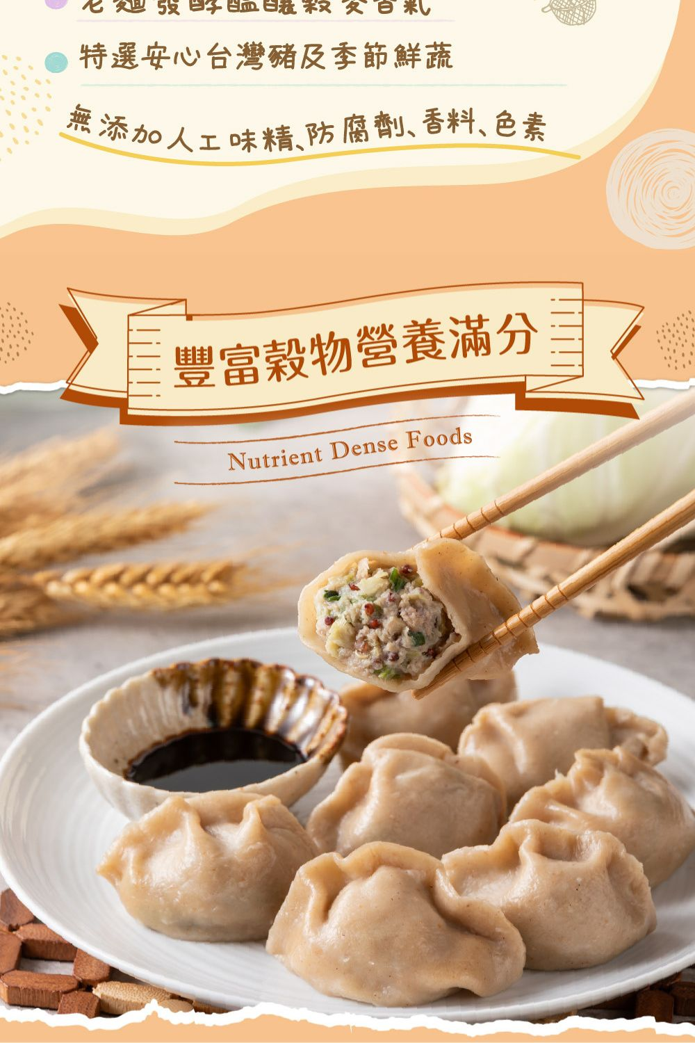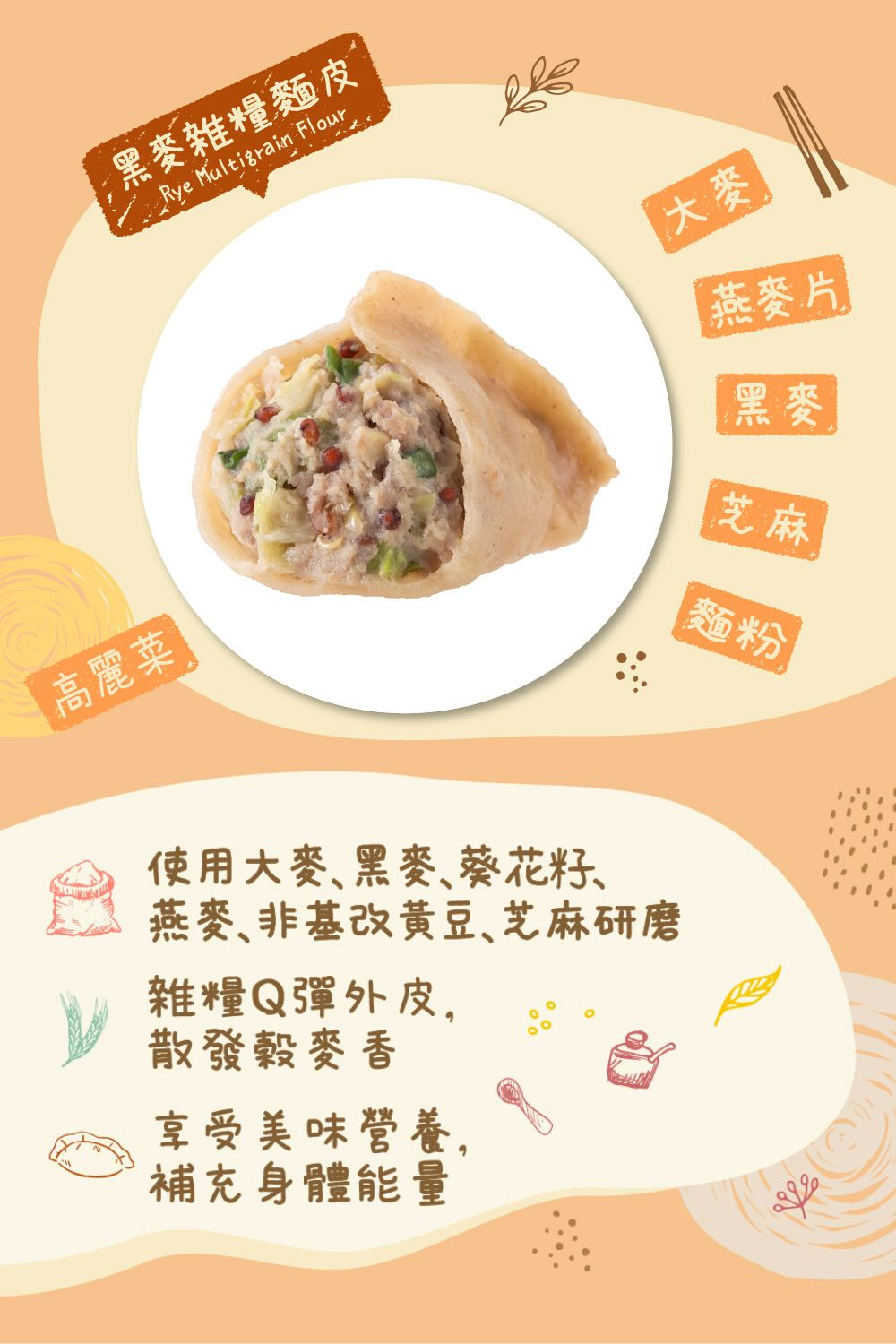 特選安心台灣豬,無抗生素、瘦肉精,季節鮮蔬增量,餃皮添用黑麥多穀,飽滿多汁完美比例Q彈口感。