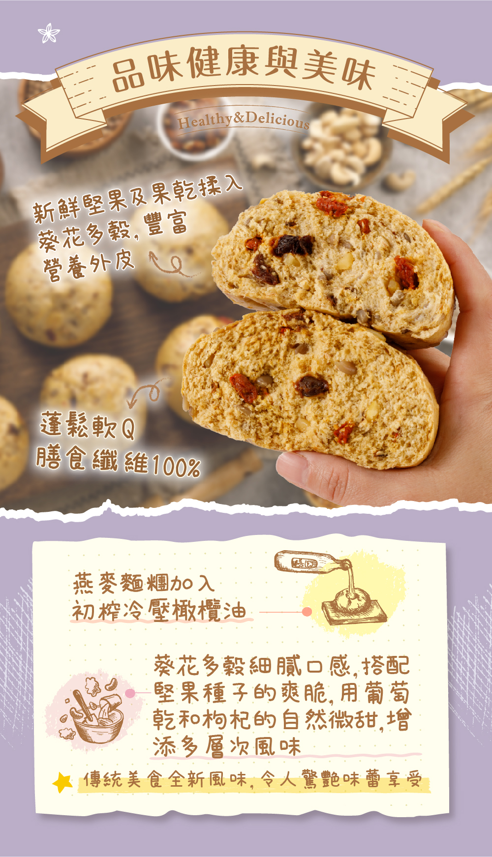 大麥燕麥添加葵花多穀雜糧,包入多種豐富堅果及果乾,新鮮葡萄乾、葵花子、枸杞、核桃、南瓜子、腰果等,提供多元營養的成分,口感紮實Q彈有嚼勁。