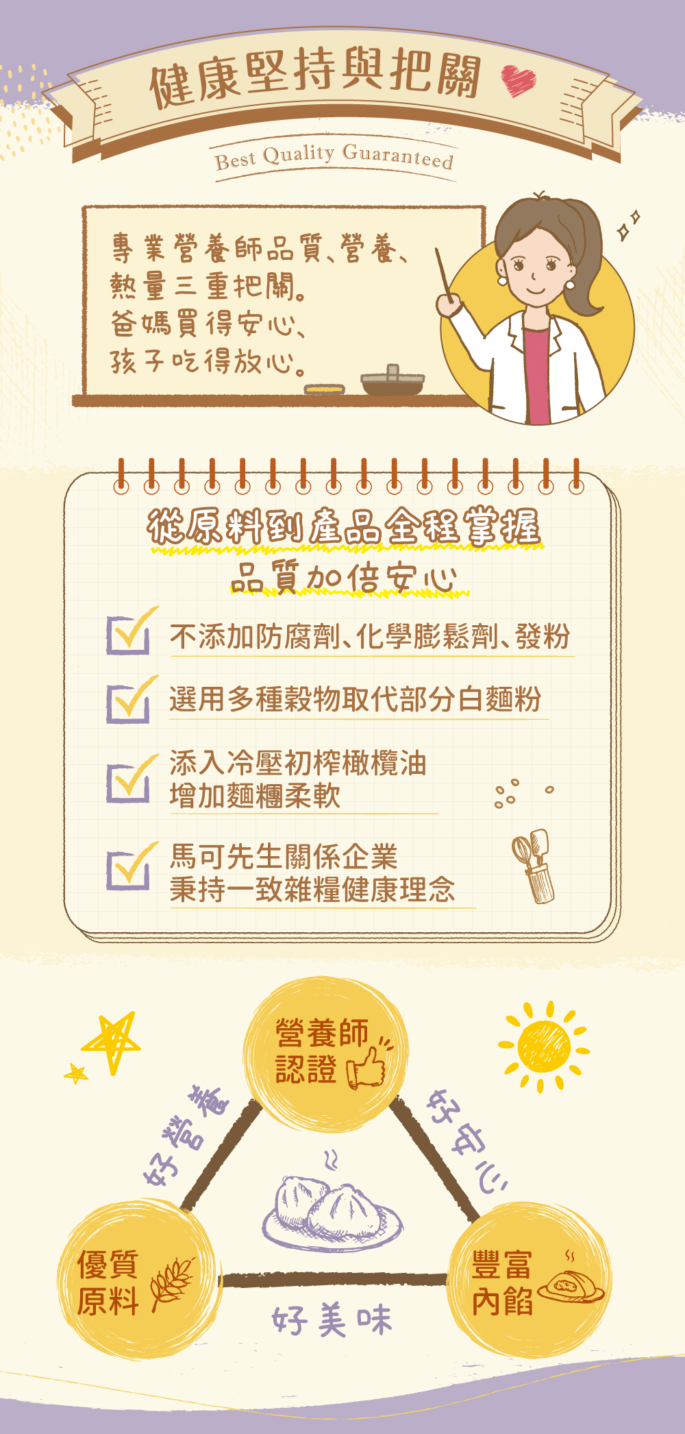 ★多層次壓麵工法、高壓保濕蒸炊機、IQF急速冷凍技術,鎖住水份保持口感,這樣繁複的工序,讓包子不用蒸炊,退冰後麵皮還保有Q彈口感