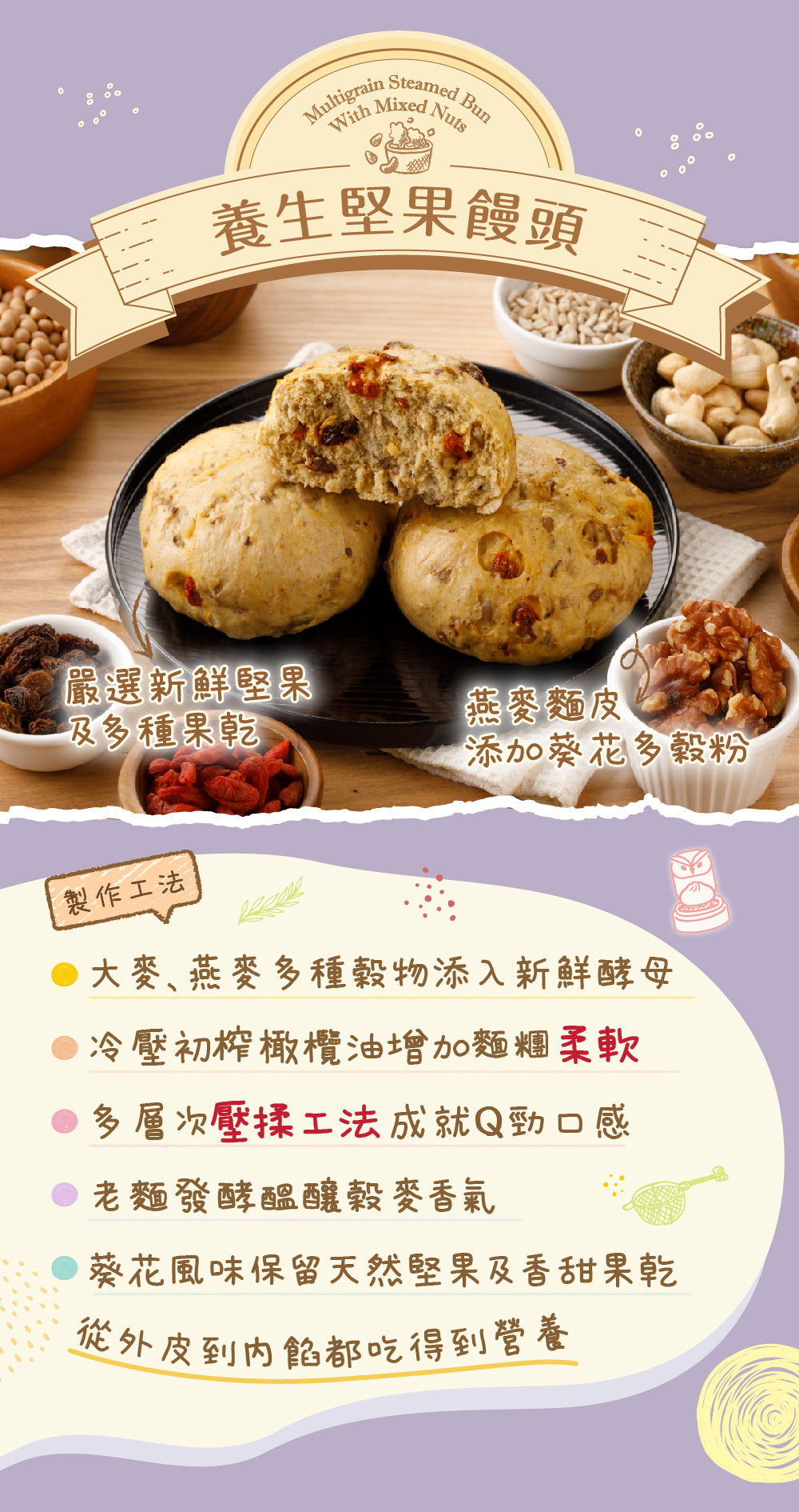 養生堅果饅頭(全素) 膳食纖維含量:5.9g/每100公克