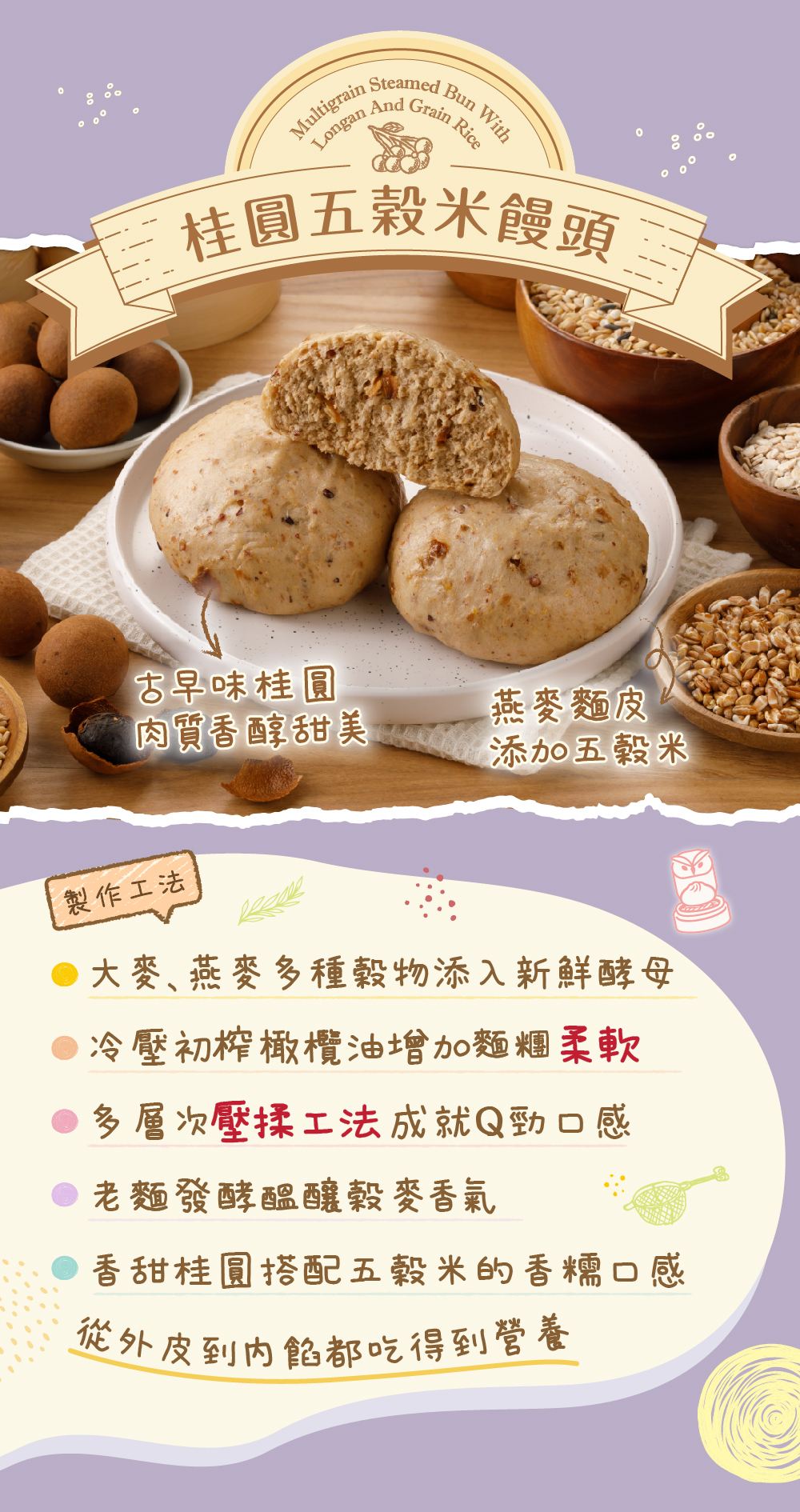 ✿採用天然桂圓添加獨特香甜味,搭配五穀米的香糯口感,無添加人工色素、防腐劑或化學香料,有多種穀物的膳食纖維,讓飽足感更十足,減輕負擔更健康!