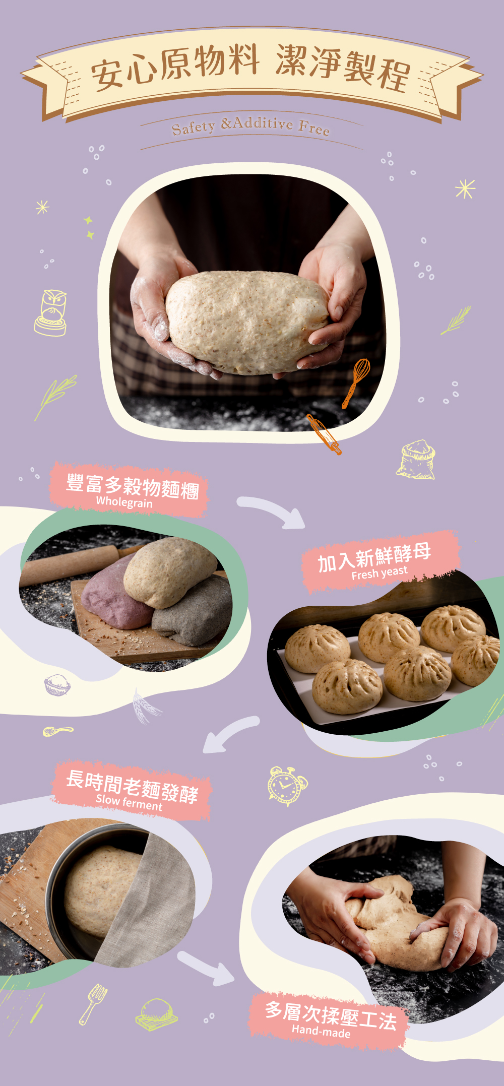 ✿選用大麥、燕麥多種穀物添入新鮮酵母及冷壓初榨橄欖油揉製麵糰,多層次壓揉工法成就Q勁口感,老麵緩慢發酵醞釀穀麥香氣。