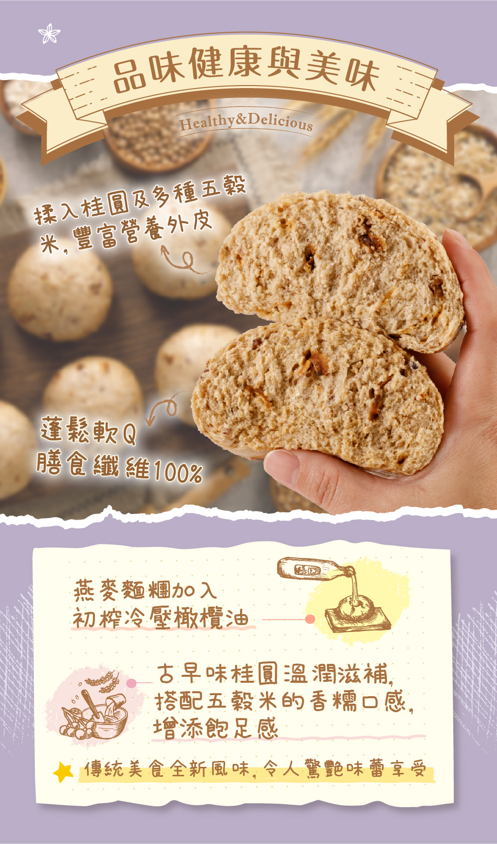 ✿採用天然桂圓添加獨特香甜味,搭配五穀米的香糯口感,無添加人工色素、防腐劑或化學香料,有多種穀物的膳食纖維,讓飽足感更十足,減輕負擔更健康!