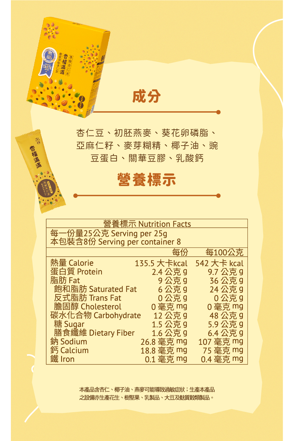 過敏原標示:本產品含有杏仁、椰子油及燕麥,不適合對其過敏體質食用;該生產線亦生產含花生、樹堅果、乳製品、大豆及麩質穀類製品。。