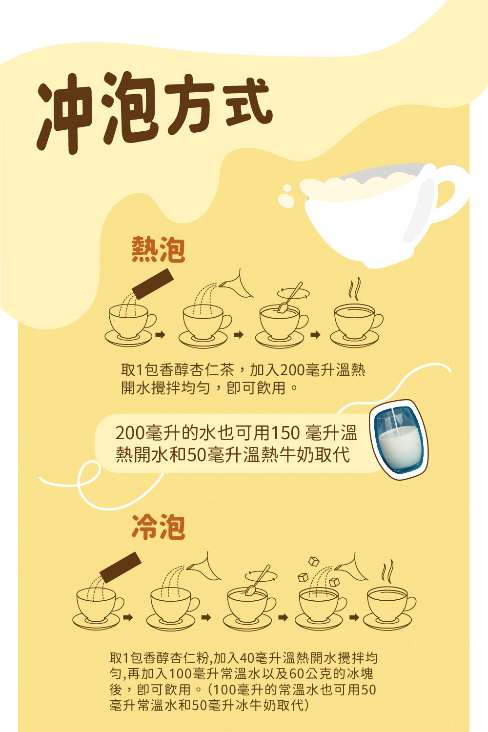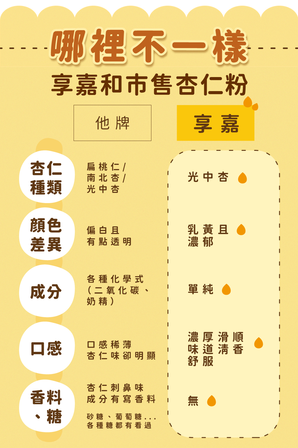 杏仁粉堅持不添加香精及額外糖分,100%純天然杏仁油脂,精心研磨製成細緻粉末,容易沖泡不結塊,口感綿密濃醇,1包即飲冷泡熱皆可,更適合乳糖不耐症來補充營養。