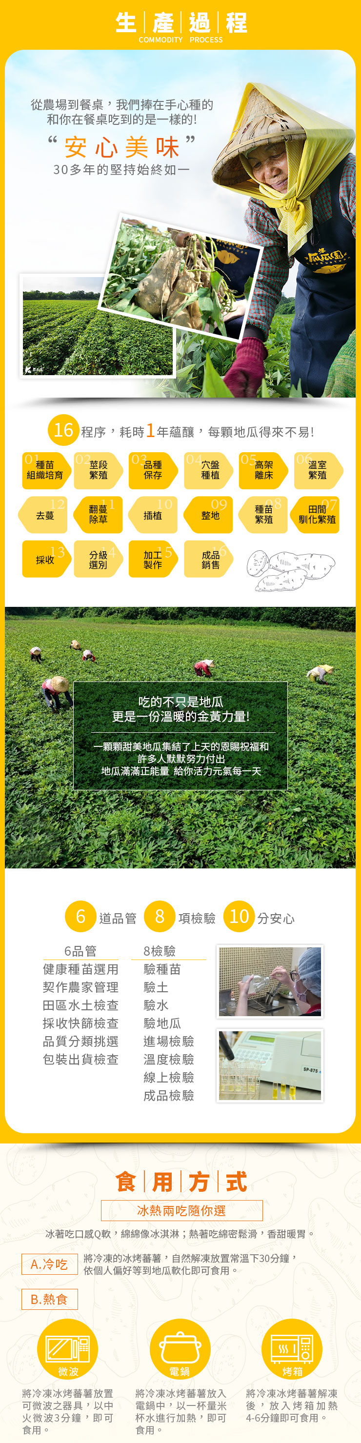 特選瓜瓜園農場優質台農57號黃地瓜,農場直送100%自然原味,從種植端的健康種苗培育、栽種、專業採收部門、原料妥善儲存分級完全、清洗與妥善包裝,再透過嚴格專業的控管烘烤加工製程,緊密的產製銷存一條龍技術才可製作出瓜瓜園獨家冰烤蕃薯。