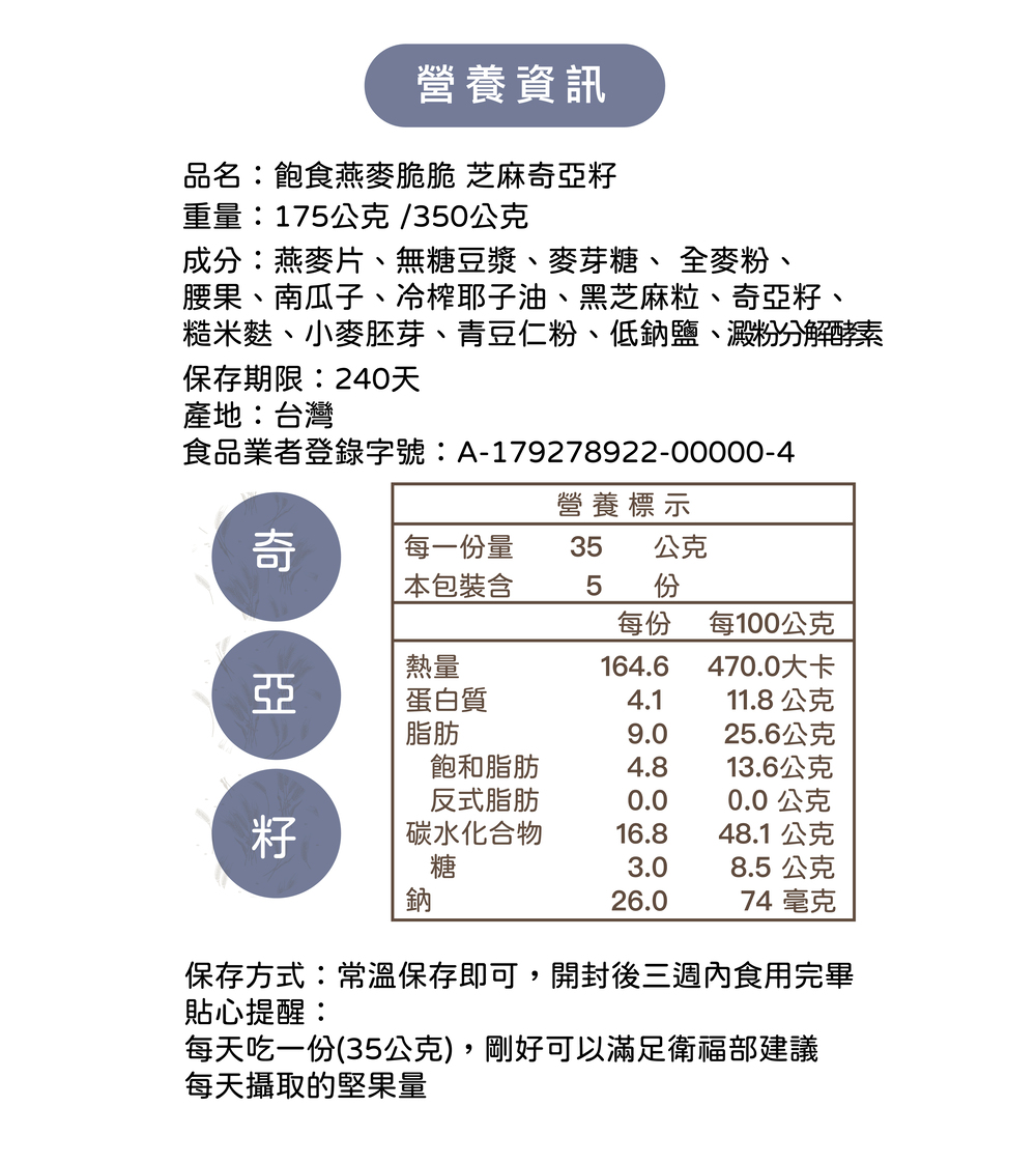 ★飽食燕麥脆脆 芝麻奇亞籽(全素/甜口味)膳食纖維含量:8.4g/每100公克