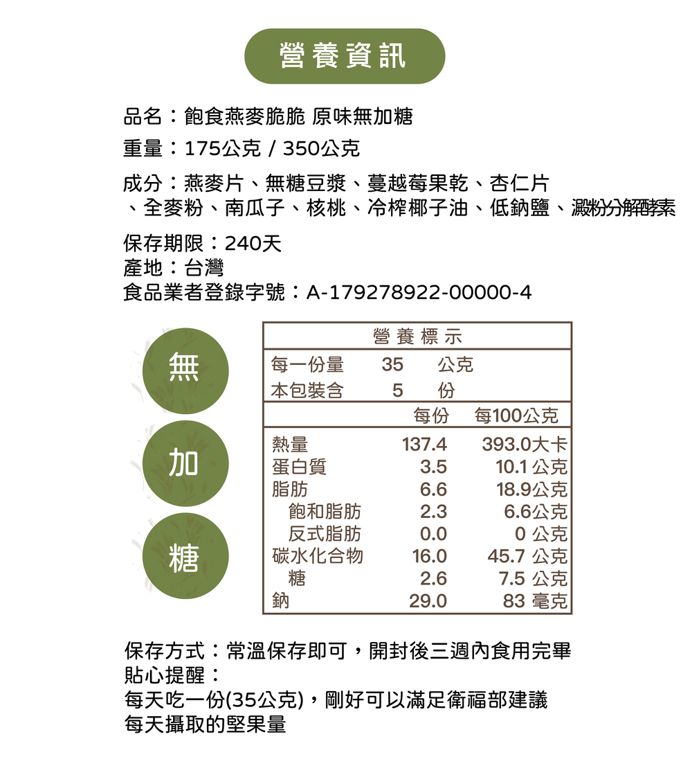 ★飽食燕麥脆脆 原味無加糖(全素/純口味)膳食纖維含量:8.5g/每100公克