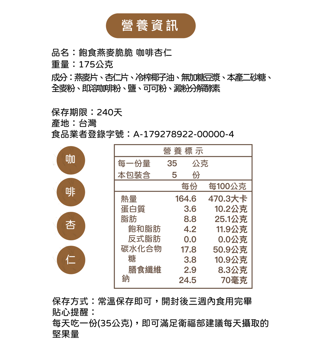 ★飽食燕麥脆脆 咖啡杏仁(全素/甜口味)膳食纖維含量:8.3g/每100公克