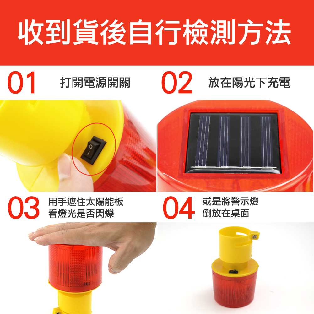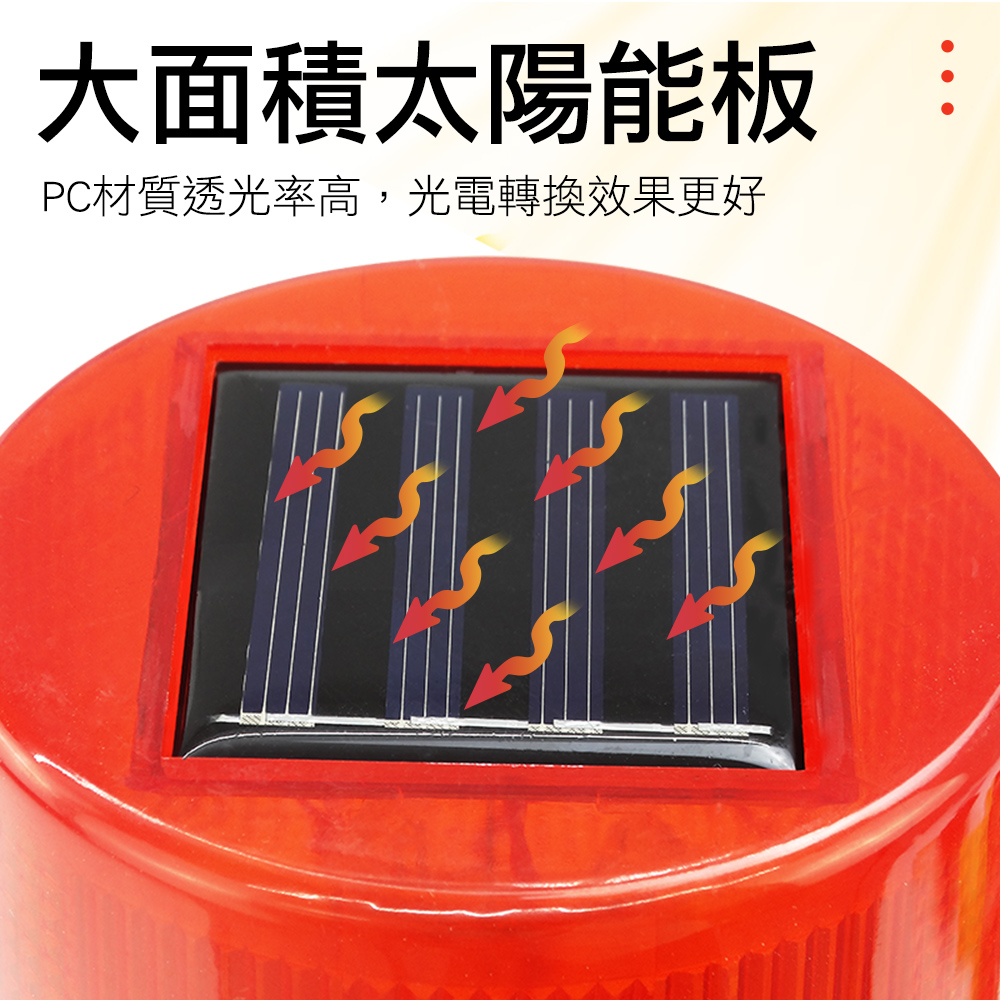 太陽能警示燈適用於道路施工、建築工程、交通警示、船舶、漁船作業等使用。低碳、環保、實惠,利用面板在白天時間接受太陽光線產生電能,晚上時將會自動閃爍,以節約能源的方式帶來效益,並提供照射光源,外殼材質堅硬、不進水,放在戶外也能使用長久。