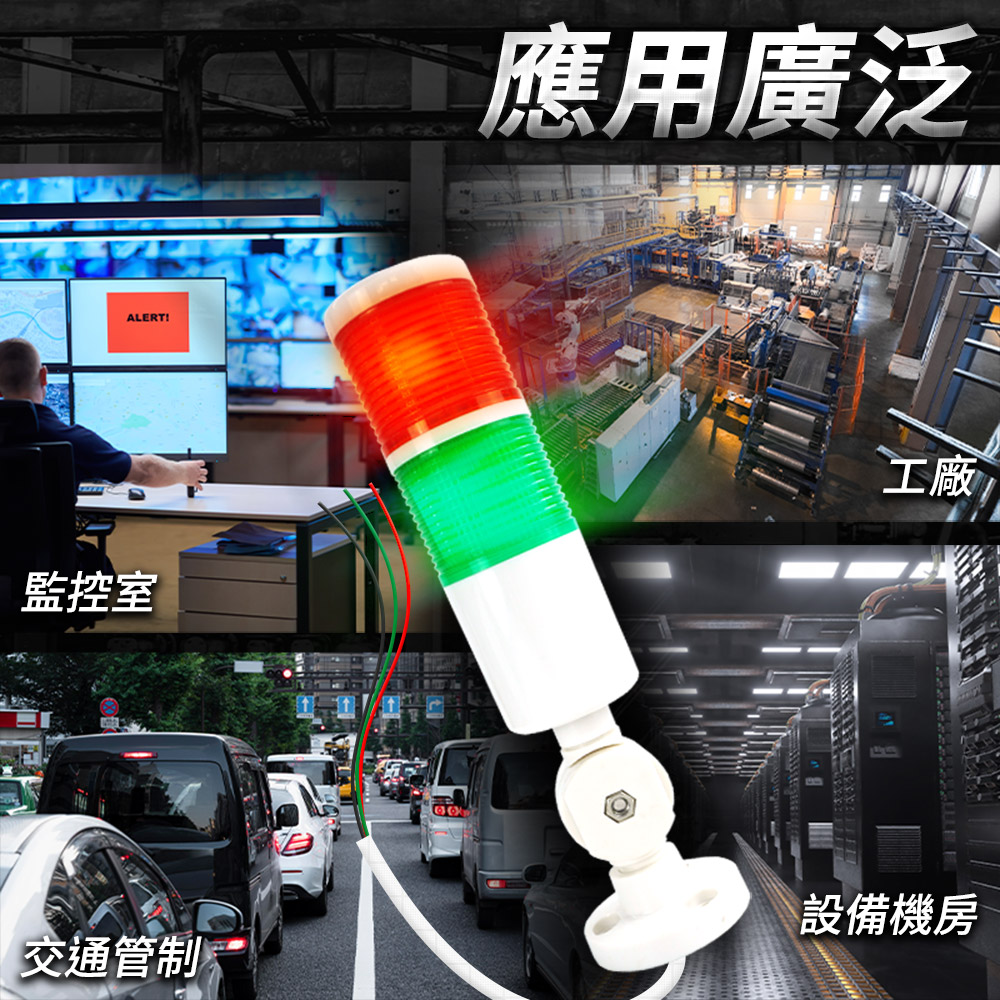 警示燈廣泛運用在廠房機械、監控室、交通管制,使用交流電源供電。一支有紅綠兩色燈光,通電後會反覆閃爍達到警示作用。採用優質ABS和PC材料,堅固抗震耐摔,使用壽命長。