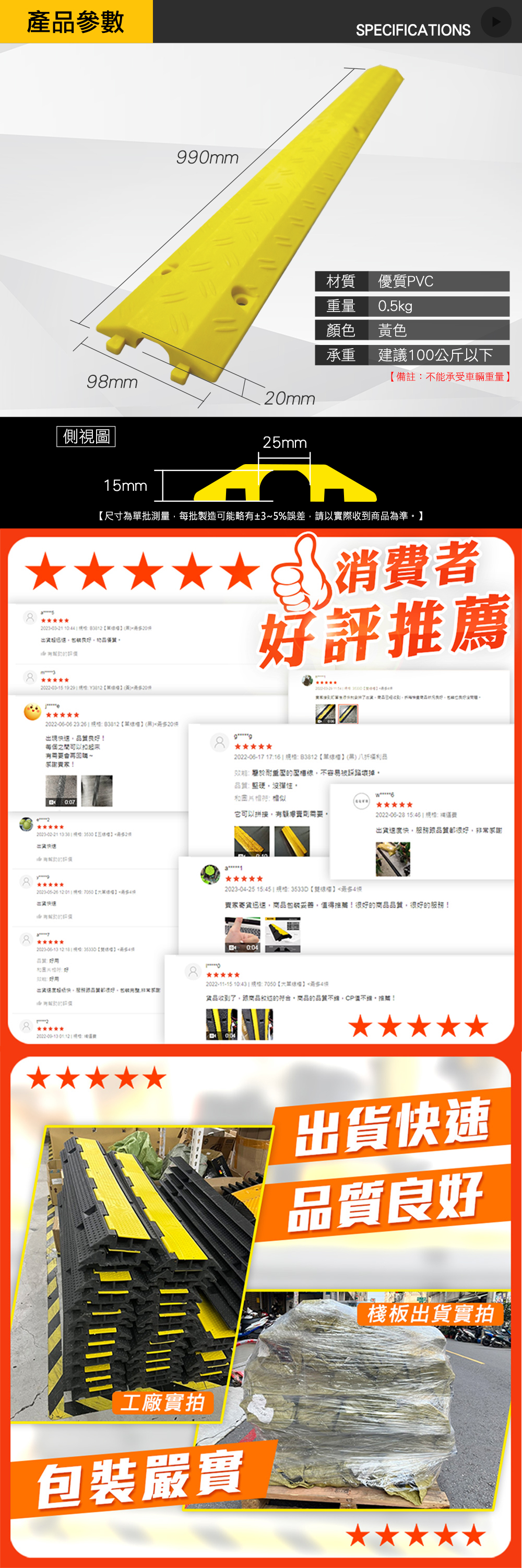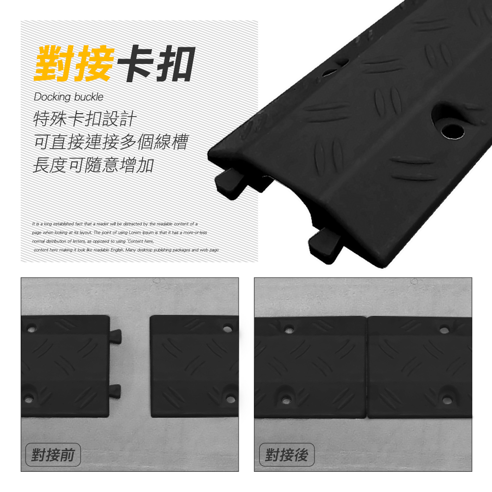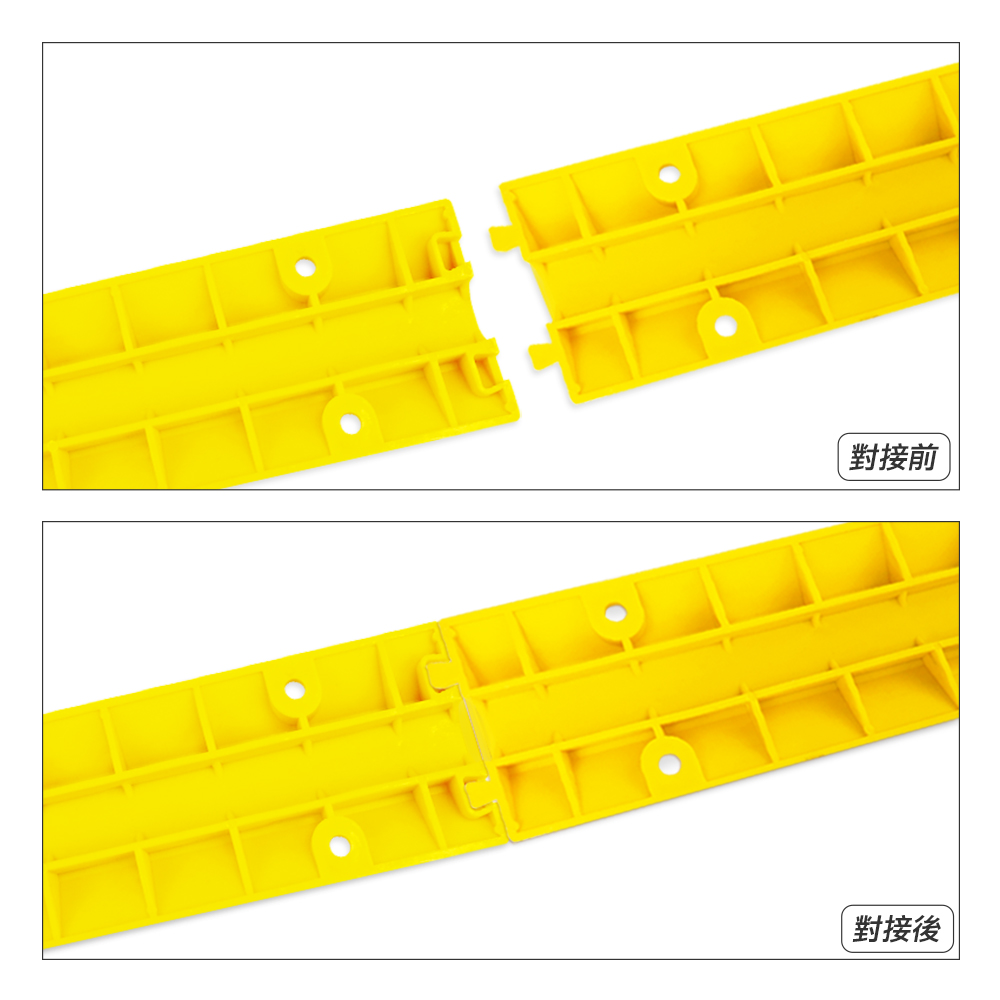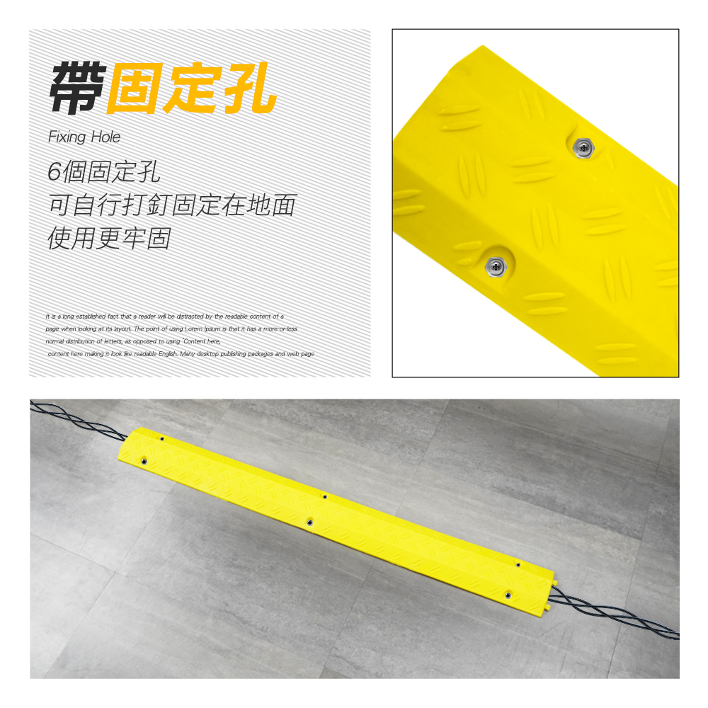 本產品是用來保護線纜、水管等各種管線的蓋板,安裝非常簡單就能上手,表面顆粒能夠增加車輪或是鞋子的摩擦力,不會因為表面光滑而造成打滑危險,整體色彩鮮明醒目,放置在地面上也能從遠處看見,有效高用路人的安全。
