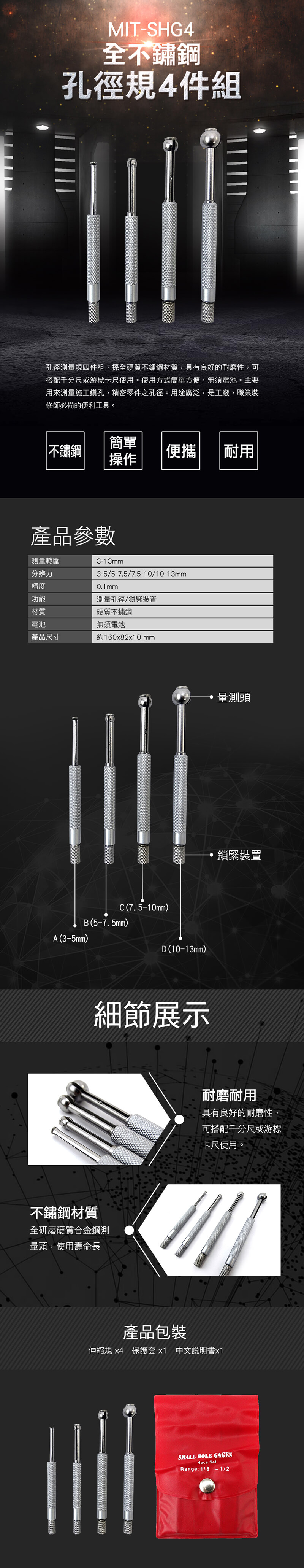孔徑測量規四件組,採全硬質不鏽鋼材質,具有良好的耐磨性,可搭配千分尺或游標卡尺使用。使用