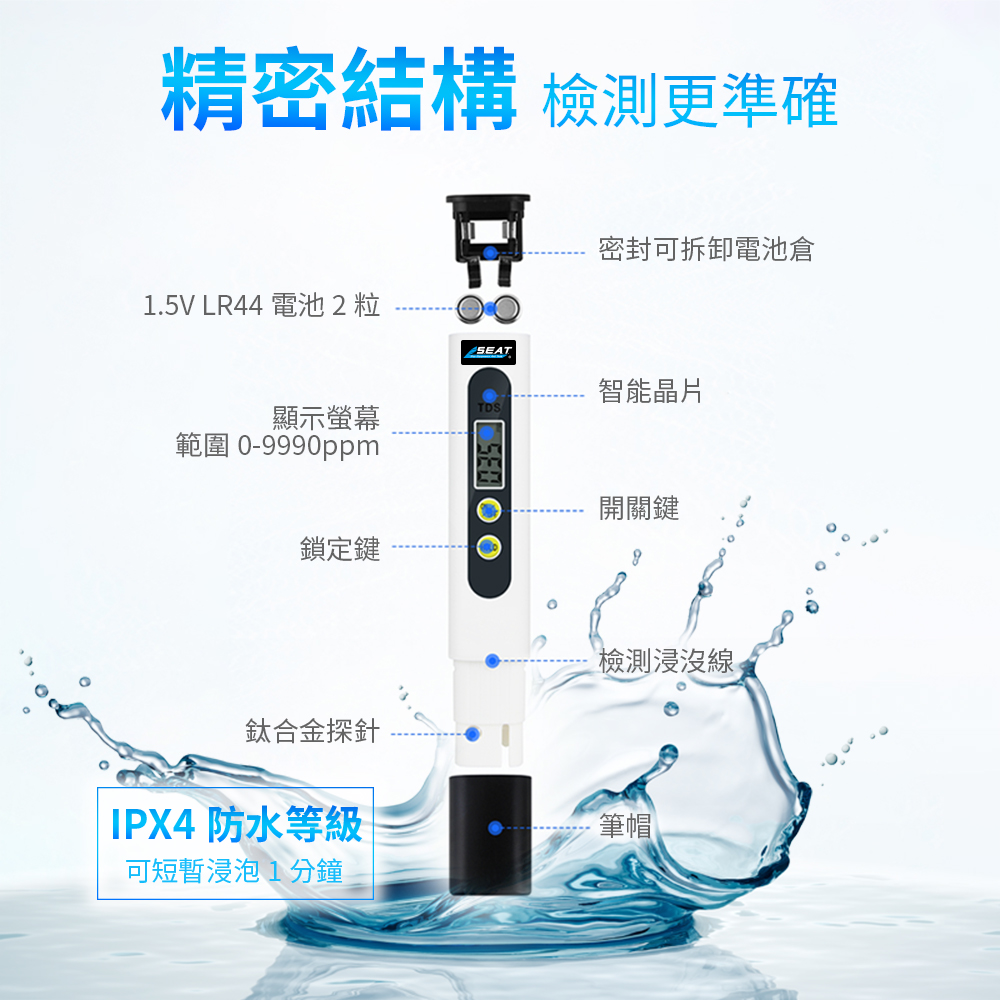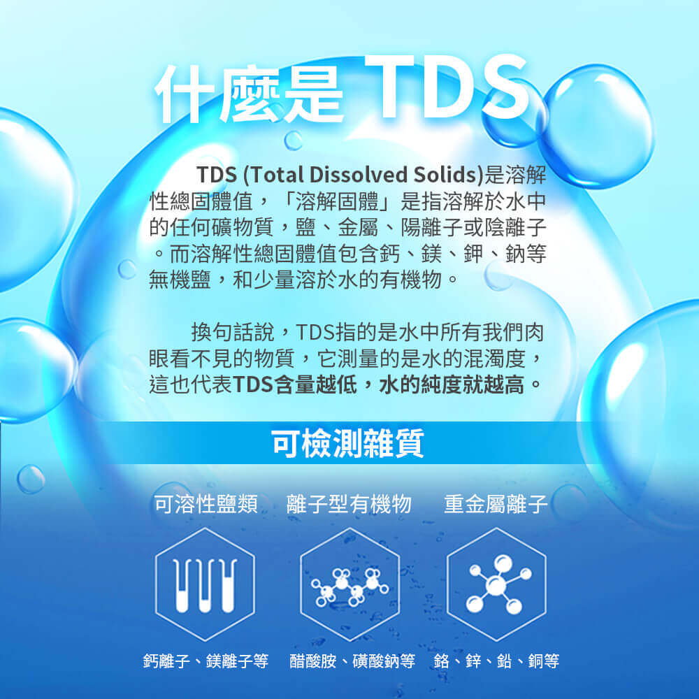 TDS是溶解性總固體值,數值越高表示雜質越多。TDS水質檢測筆可以協助檢測水中TDS值,替好水質把關。適用於生活用水、泳池、淨水器、水族、魚塭、環境水質、科研等需要水質檢測之環境。