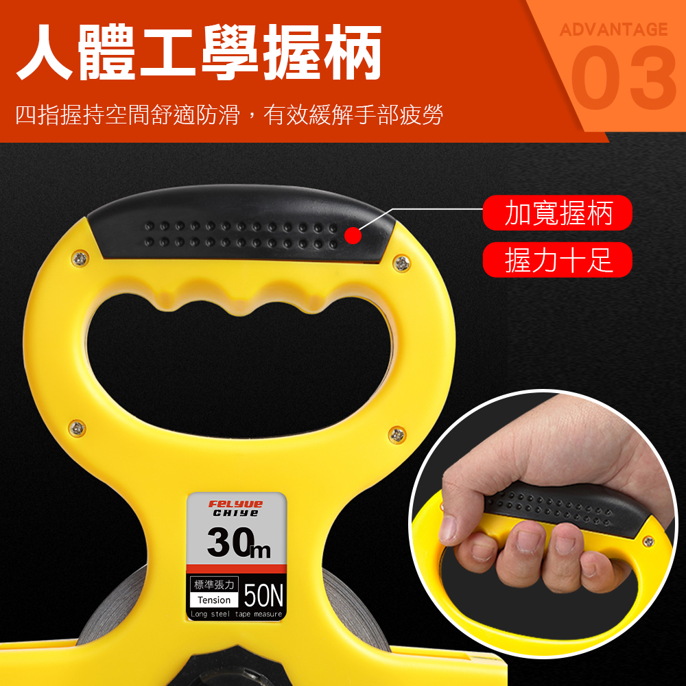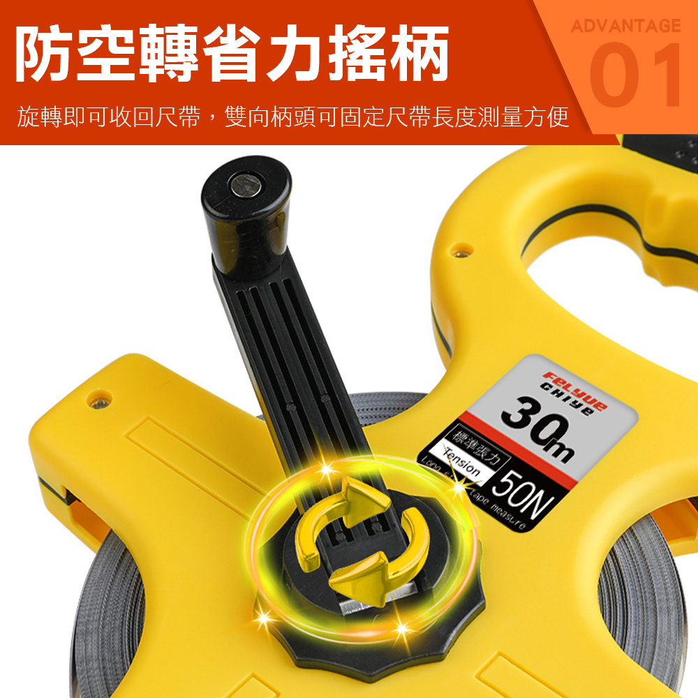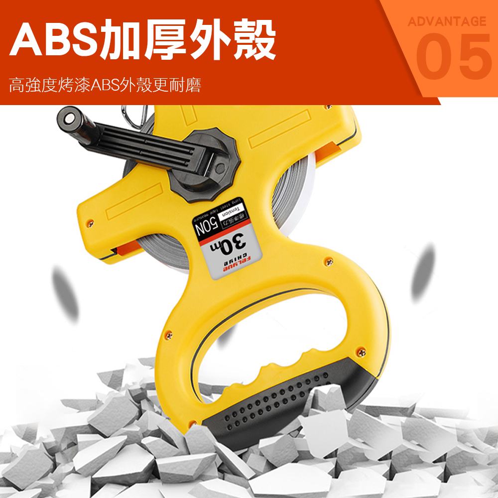 場地測量手提尺採用烤漆尺帶,前端為UV電鍍錐形尖頭,硬度高適用多種路況環境,手搖式搖柄旋轉即可收回尺帶,尺帶兩側金屬包邊有效減少尺帶拉出的摩擦,ABS加厚外殼更耐用。