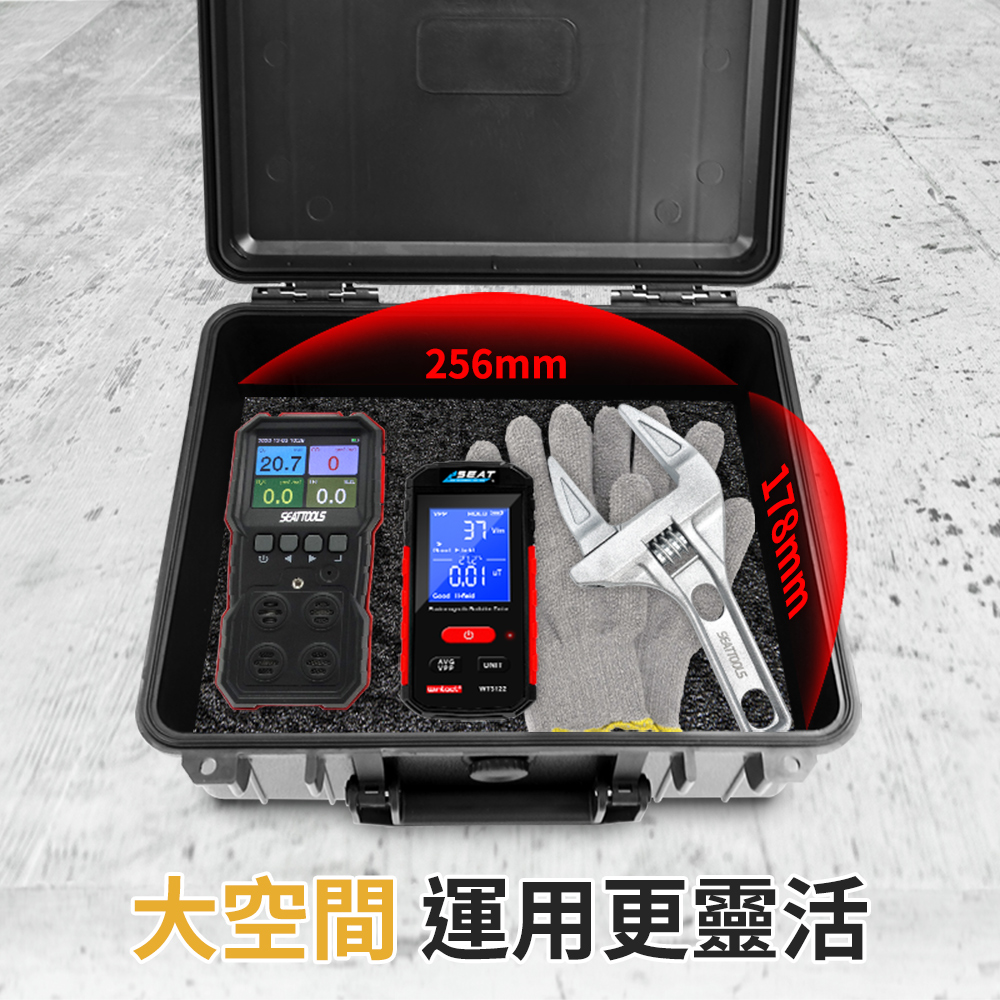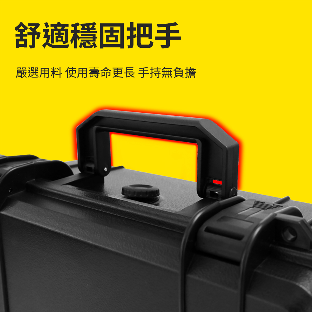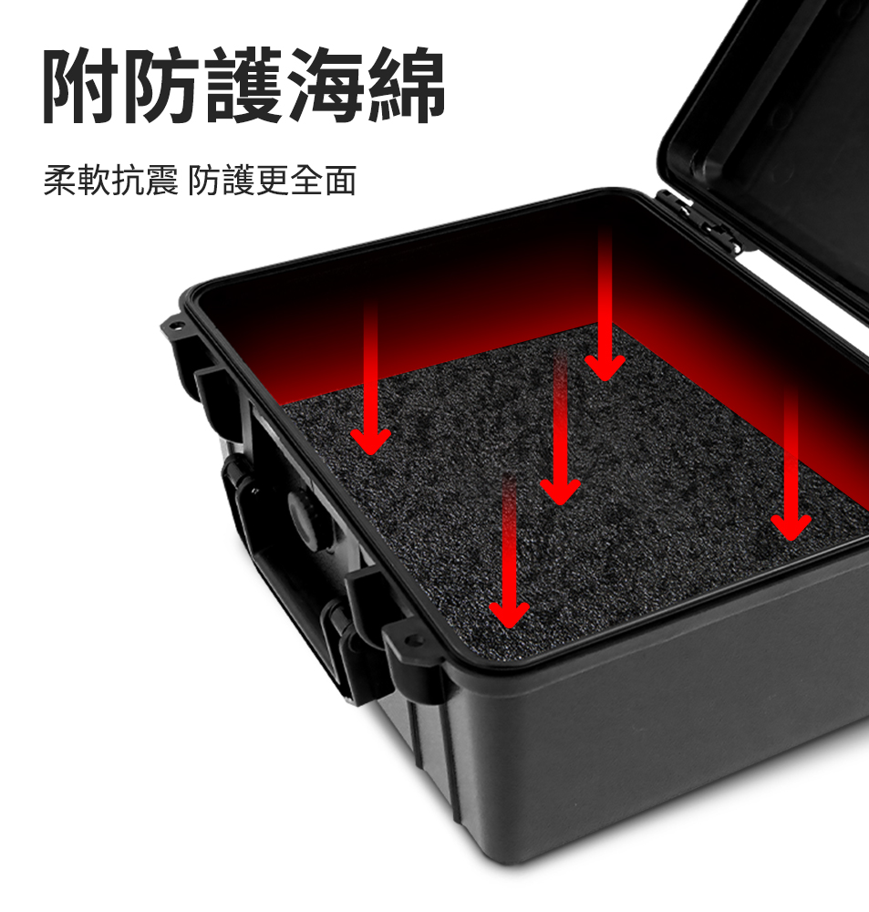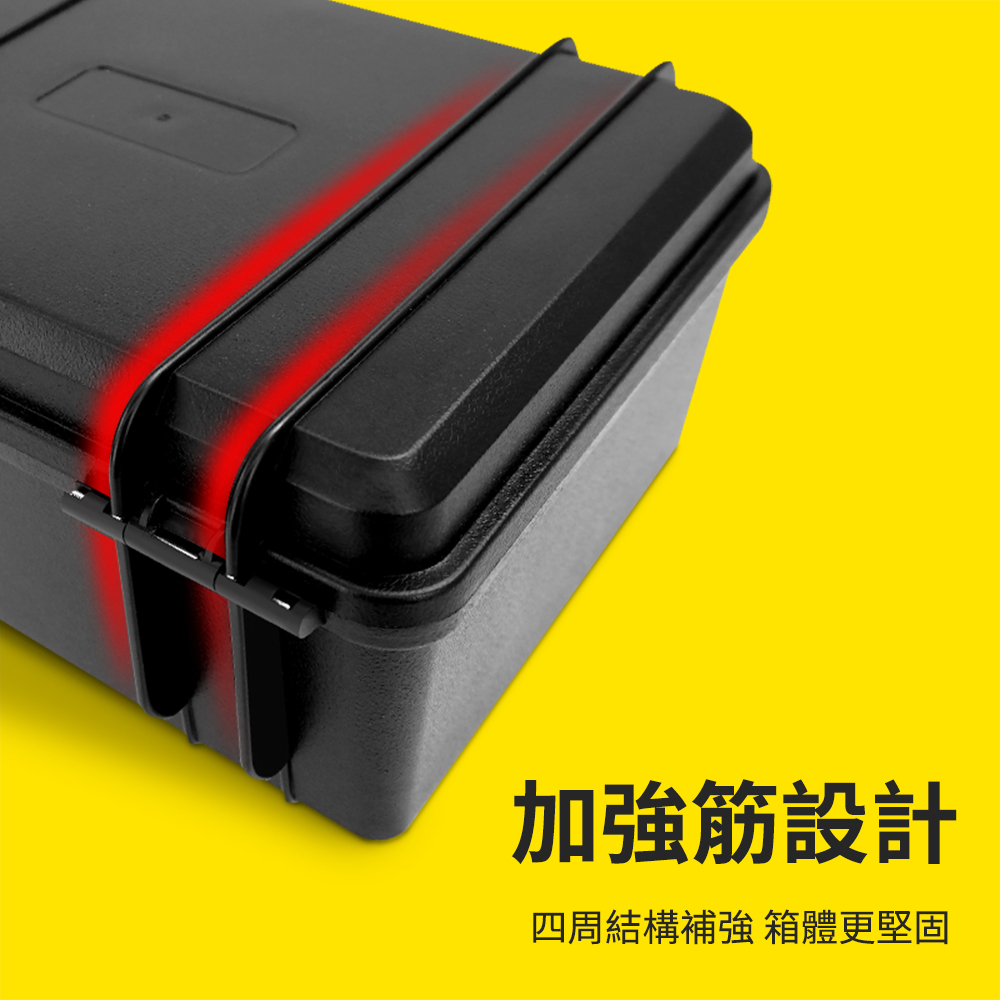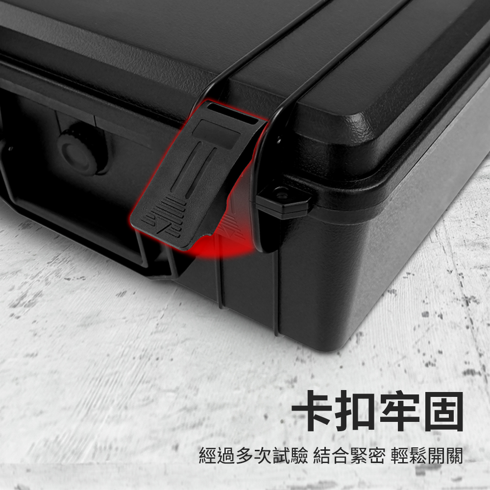 儀器保護箱內附抗震海棉,可收納各種儀器和工具。嚴選ABS塑膠材質,使用壽命長不易損壞;卡扣緊密,劇烈搖晃也不會鬆動,可另購密碼鎖搭配使用,防護效果更完整。