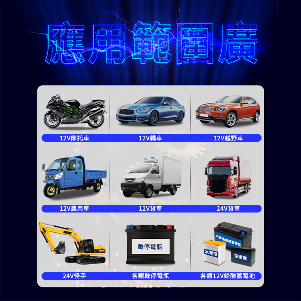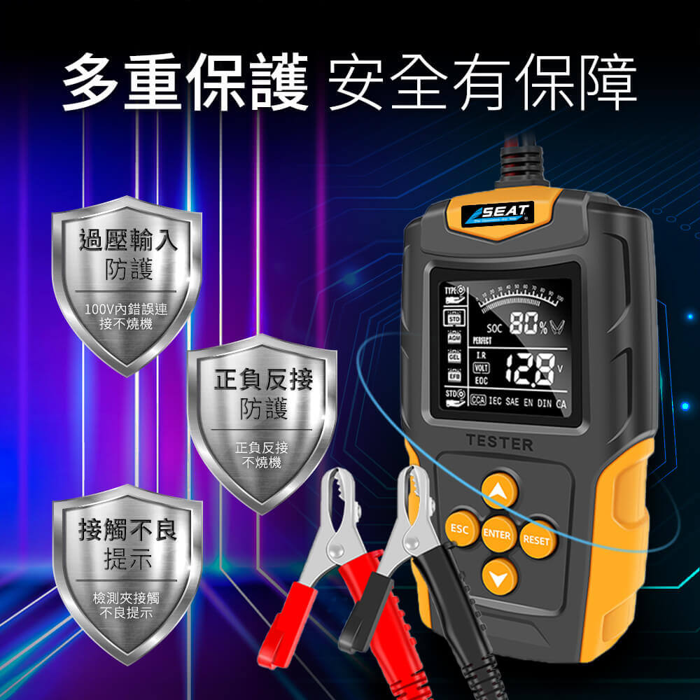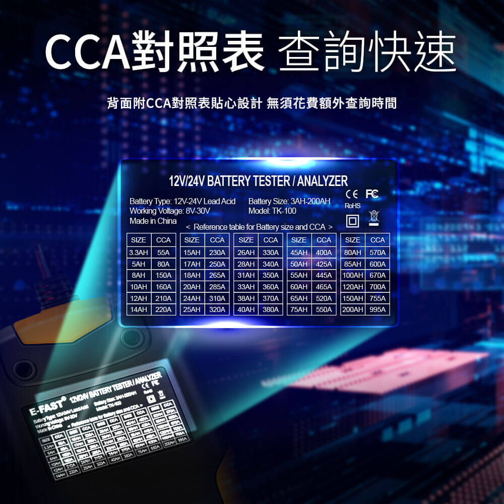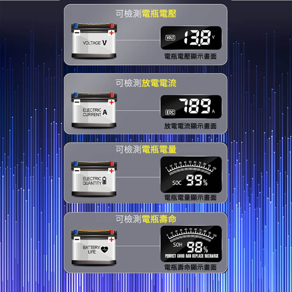 適用範圍:3~200AH/12-24V鉛酸蓄電池(鋰電池不可檢測)