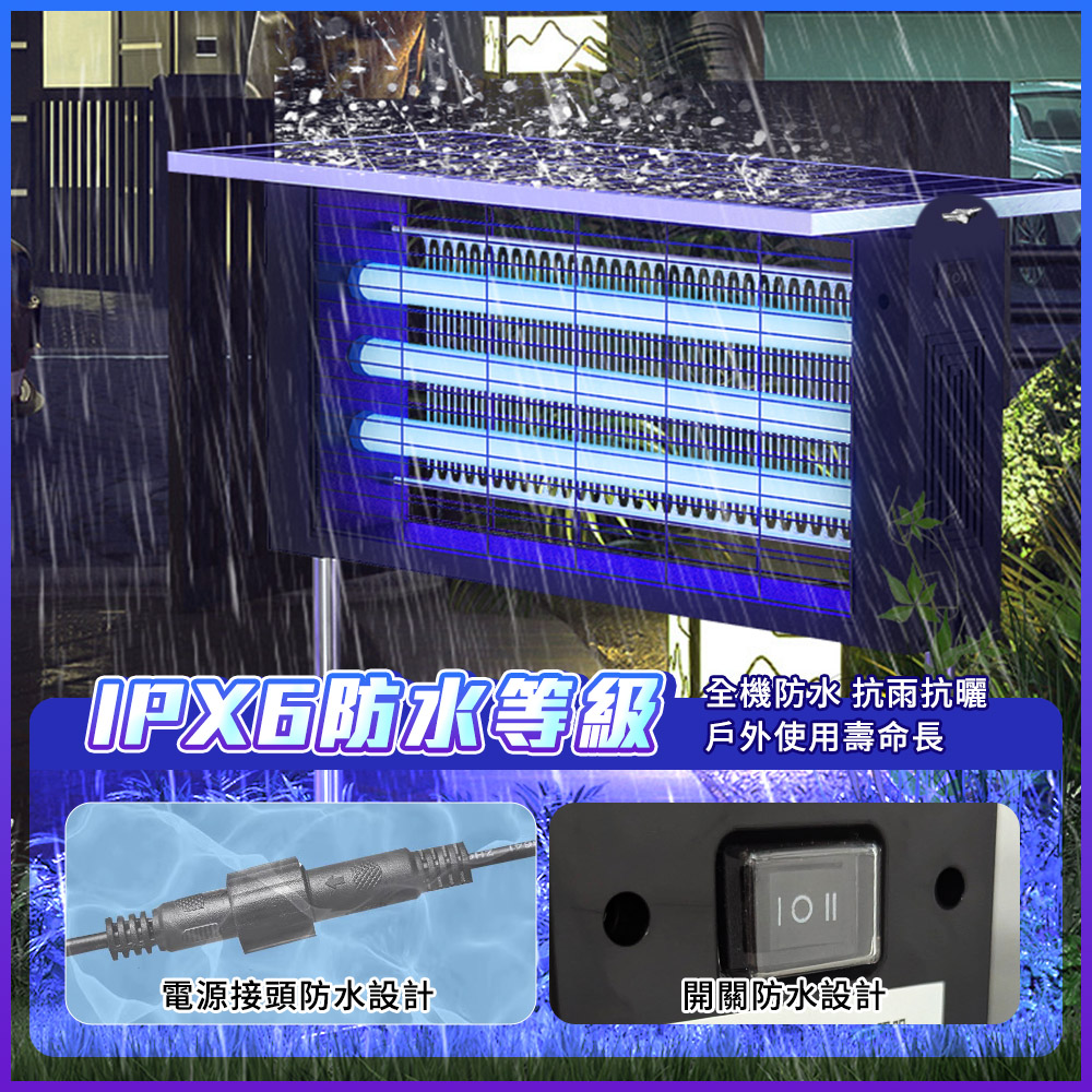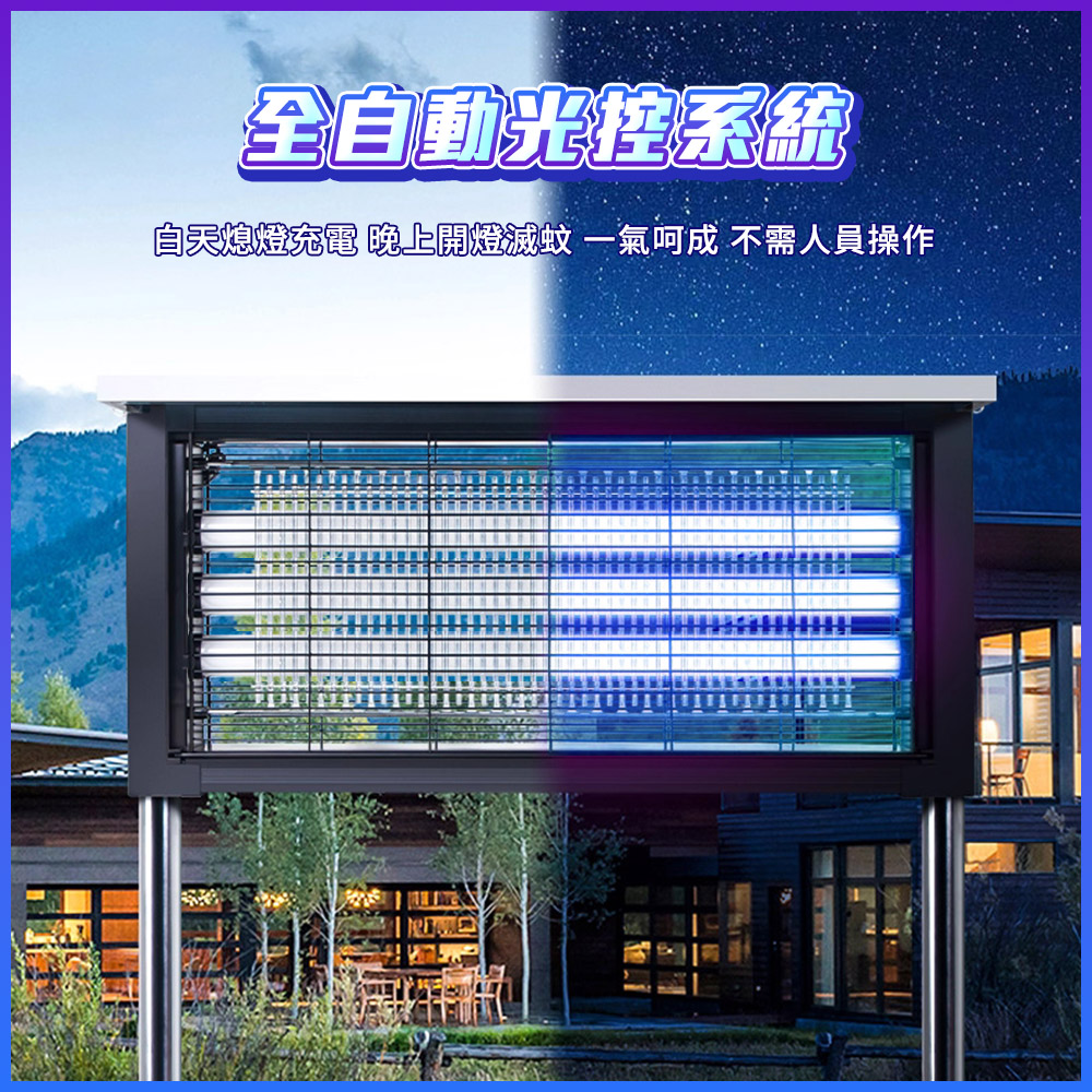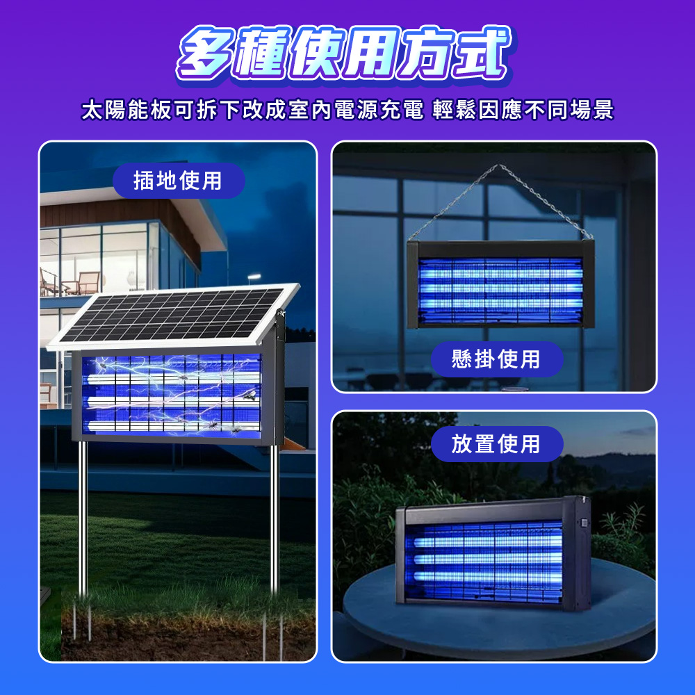 擺脫蚊蟲騷擾,享受清靜夏夜!太陽能滅蚊燈,採用高效3管30瓦燈管,300㎡大範圍滅蚊,IPX6防水等級,戶外風吹雨淋無懼。太陽能+插電兩用,持續守護,附清潔刷輕鬆打理。適用庭院、露營、農場、魚池,防蚊無死角!