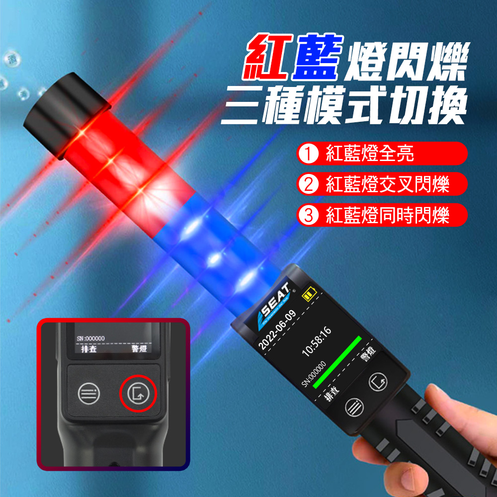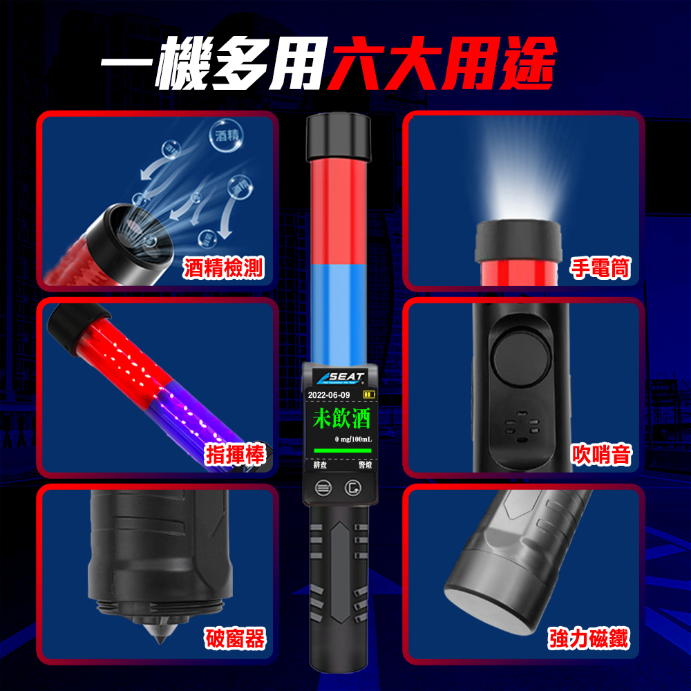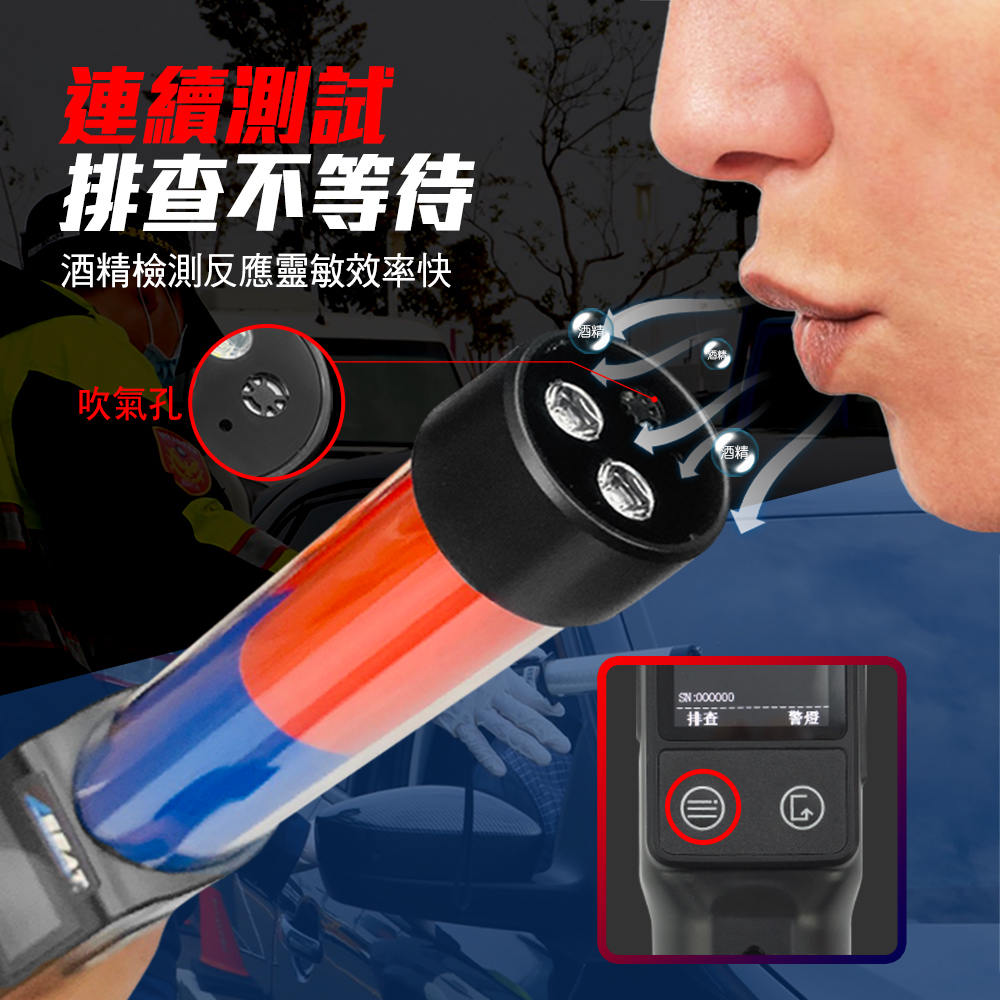 指揮棒酒測儀是檢測人體吹出氣體中酒精含量的儀器,選用高準確度酒精感應器,具有較好的靈敏度和重複性、MCU智能檢測,工作流程合理簡潔便利。採用連續泵吸的抽氣方式,進行自動抽氣檢測。高亮OLED顯示屏選單式操作,測量的酒精讀數,可實際顯示在螢幕上。測量過程中配有語音提示,若超標時會有警示燈和馬達震動,另外還有手電筒、磁吸、破窗功能,適用於警察、交警、巡警、保安等。