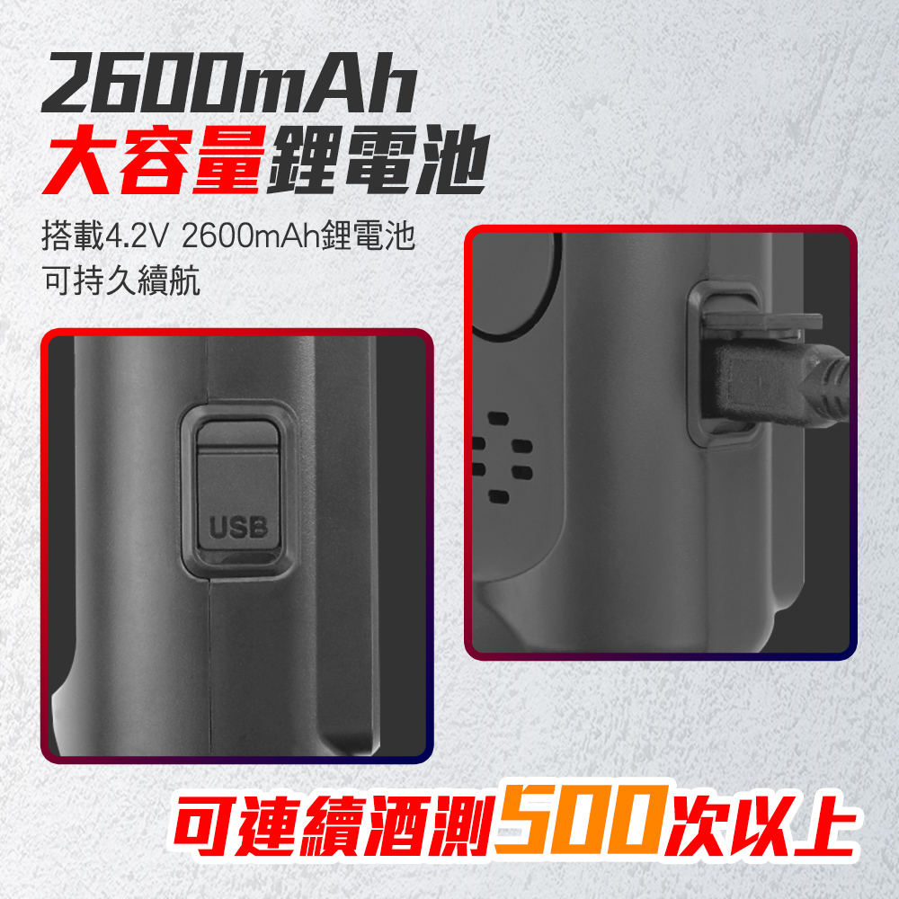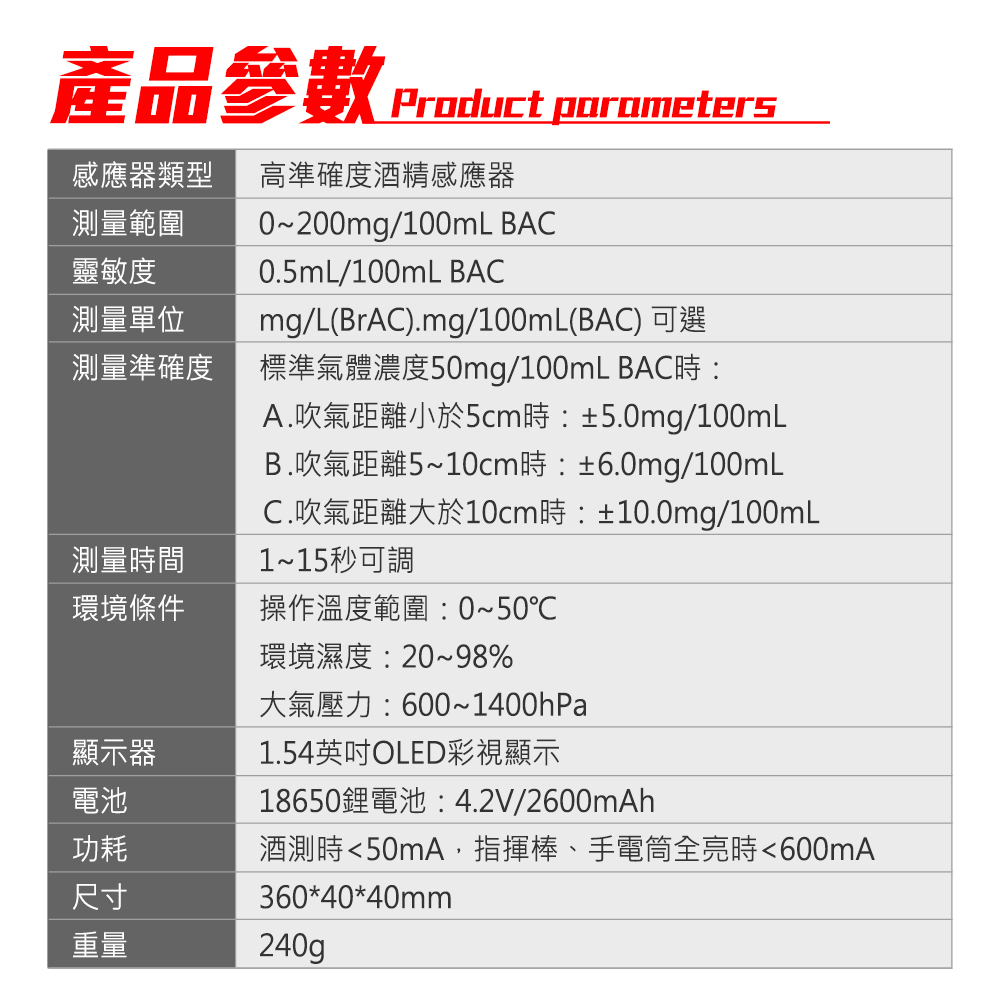 功耗:酒測時<50mA,指揮棒、手電筒全亮時<600mA