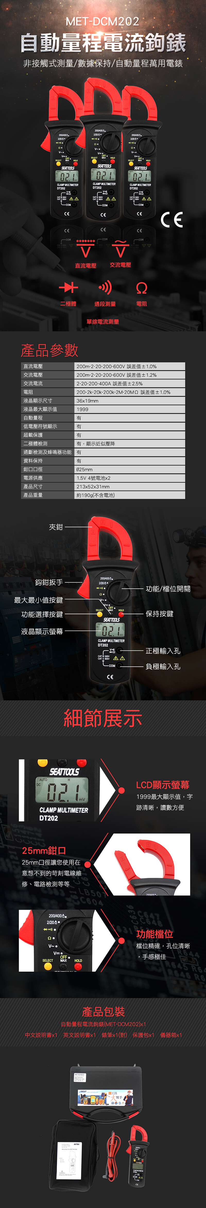 產品包含自動量程電流鉤錶(MET-DCM202)x1中文說明書x1、英文說明書x1、錶筆x1(對)、保護包x1、儀器箱x1