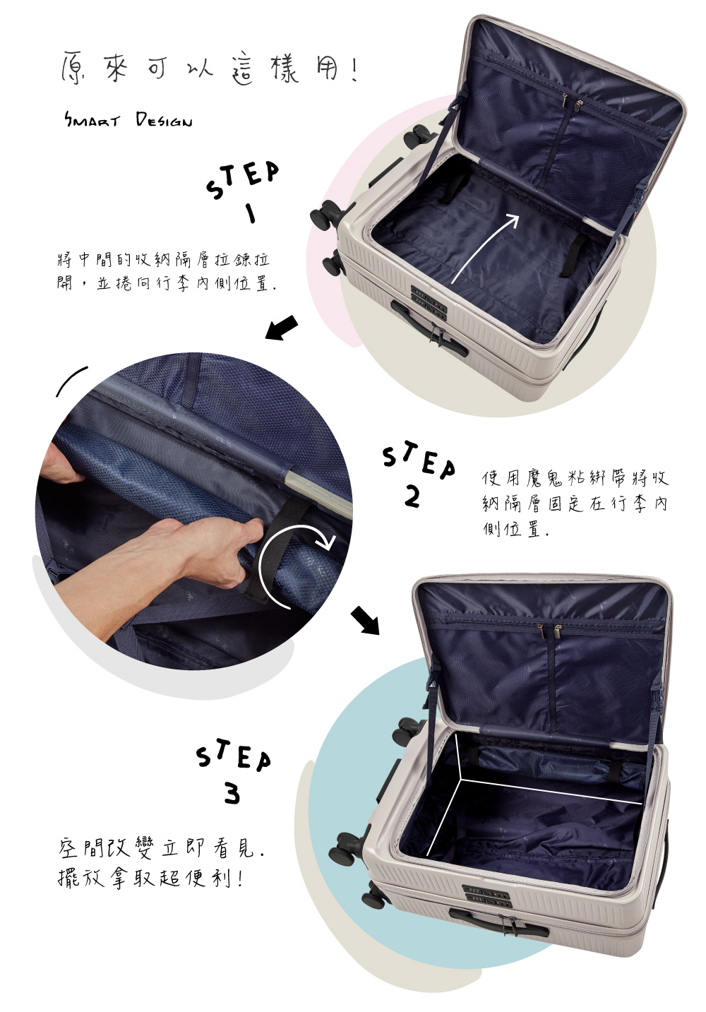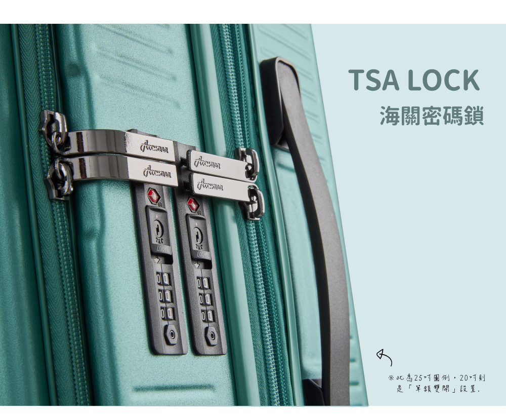 配件:避震彈簧輪、TSA海關密碼鎖、便捷式手機架、輔助把手、防爆拉鍊
