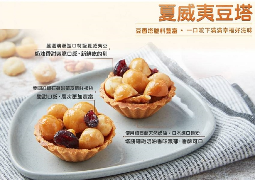 楓糖牛奶夏威夷豆塔:麵粉、頂級進口奶油、砂糖、夏威夷豆、核桃、蔓越莓、雞蛋、加拿大楓糖、奶粉、乳酪