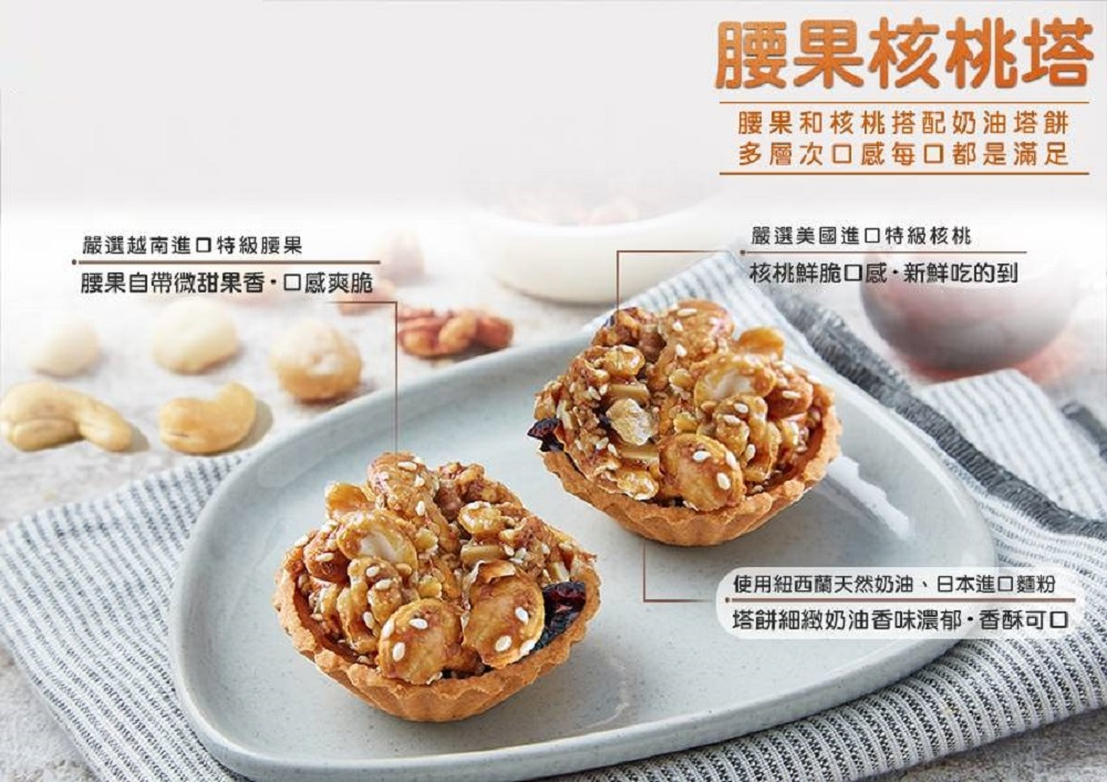 腰果核桃塔:麵粉、頂級進口奶油、砂糖、核桃、腰果、白芝麻、雞蛋、蔓越莓、奶粉、乳酪