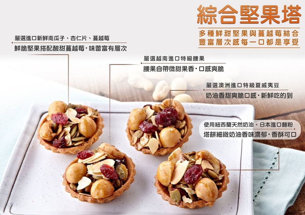 綜合堅果塔:麵粉、頂級進口奶油、砂糖、蔓越莓、夏威夷豆、核桃、南瓜子、杏仁、雞蛋、加拿大楓糖、奶粉、乳酪