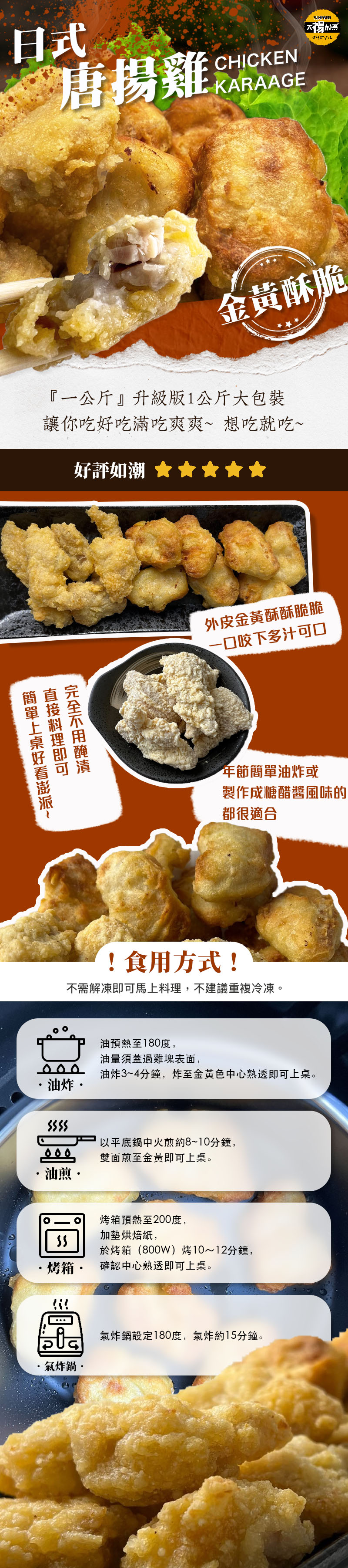 1).油炸:油預熱至180度,油量須蓋過雞塊表面,油炸3~4分鐘,炸至金黃色中心熟透即可上桌。