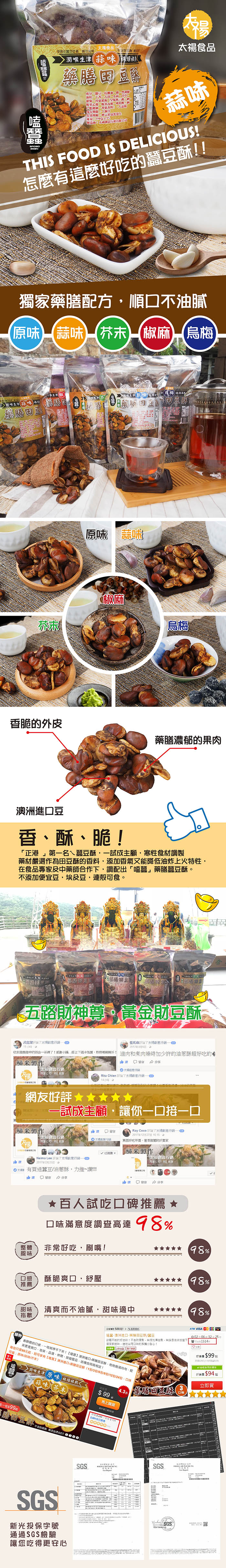 【蒜味】:蠶豆(澳洲)、棕櫚油、鹽、黑胡椒、油桂、丁香、大茴、小茴、甘草、甜菊、珍菇精粉(呈味核苷酸二納、胺基乙酸、胺基丙酸、琥珀酸二納、L-麩酸鈉、香菇香料)、甜菊萃、大蒜精食用酒精(丙二醇、蒜頭萃取物)