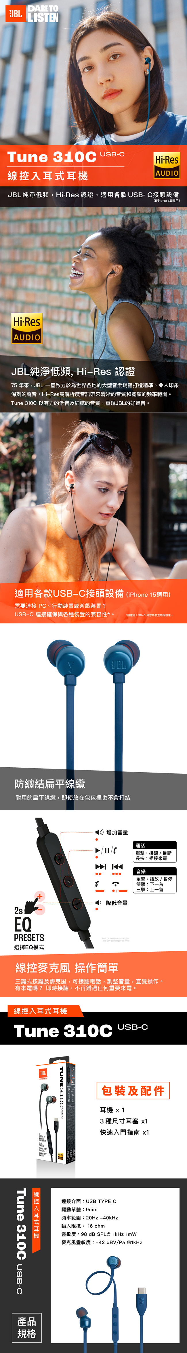【JBL】USB-C/Type-C 線控入耳式耳機 Tune 310C