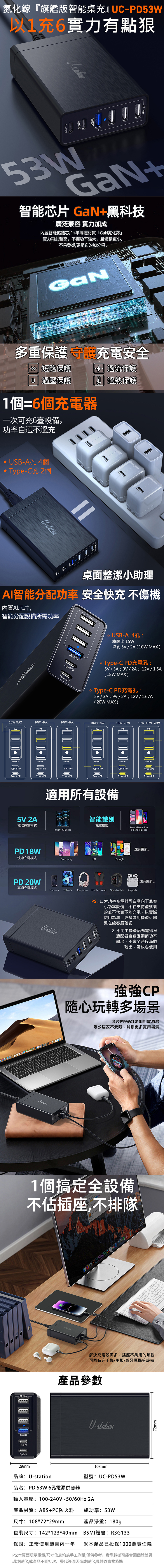 新品上市【U-station】PD 氮化镓GaN 53W 6孔電源供應器/充電器 UC-PD53W