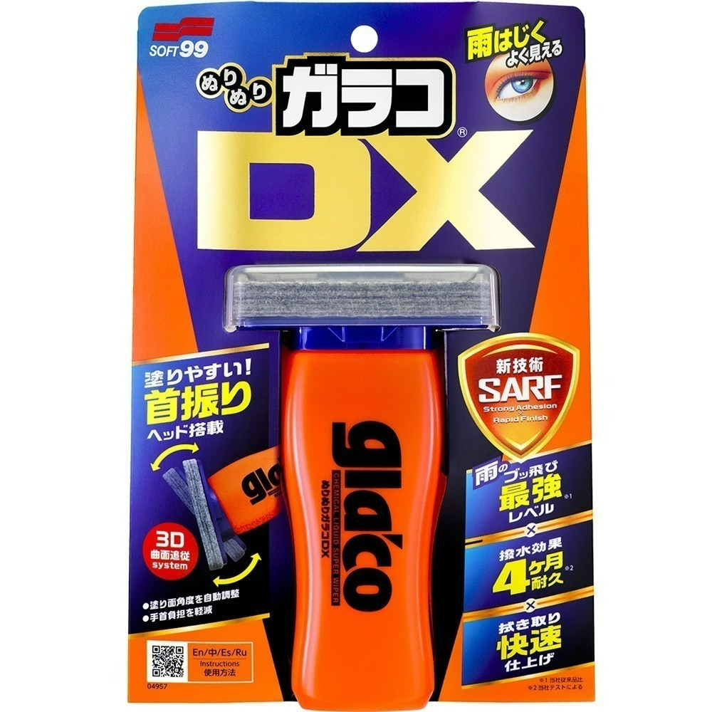 特色:glaco系列中最強撥水性、耐久性及操作性,利用新技術「SARF」形成超越傳統技術的均勻鍍膜。將阻力降低到極致,雨滴落下後順勢滑落。儘管不含氟素樹脂,撥水效果約持續四個月。透過「蹺蹺板式施工頭」與「寬方型毛氈」,自動調節施工面與角度,即使在垂直的玻璃面上,也能讓鍍膜液流出,輕輕塗抹不同角度的玻璃。同時也讓油膜、雪、霜等難以附著。