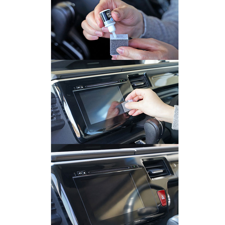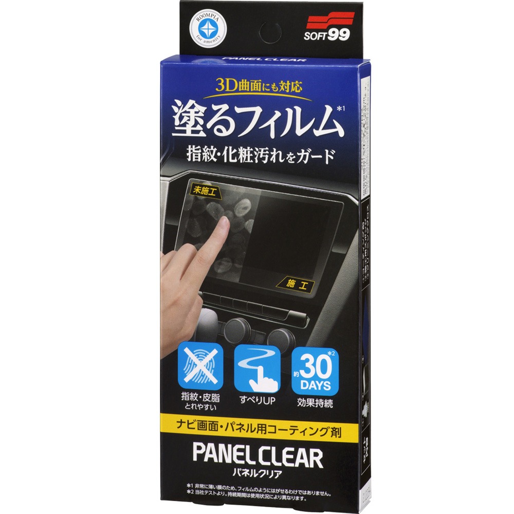 藉由兩種氟素化合物,抑制指紋、油脂、粉底,防曬乳液等附著,效果持續約30天。透過布擦拭,可輕易清潔,不但提高滑順度更提升操作度。除了汽車導航螢幕外,還可用於車內光澤塑膠零件、後視鏡、智慧型手機、平板電腦螢幕等,定期施工,可確保螢幕隨時保持防汙及美觀的效果。