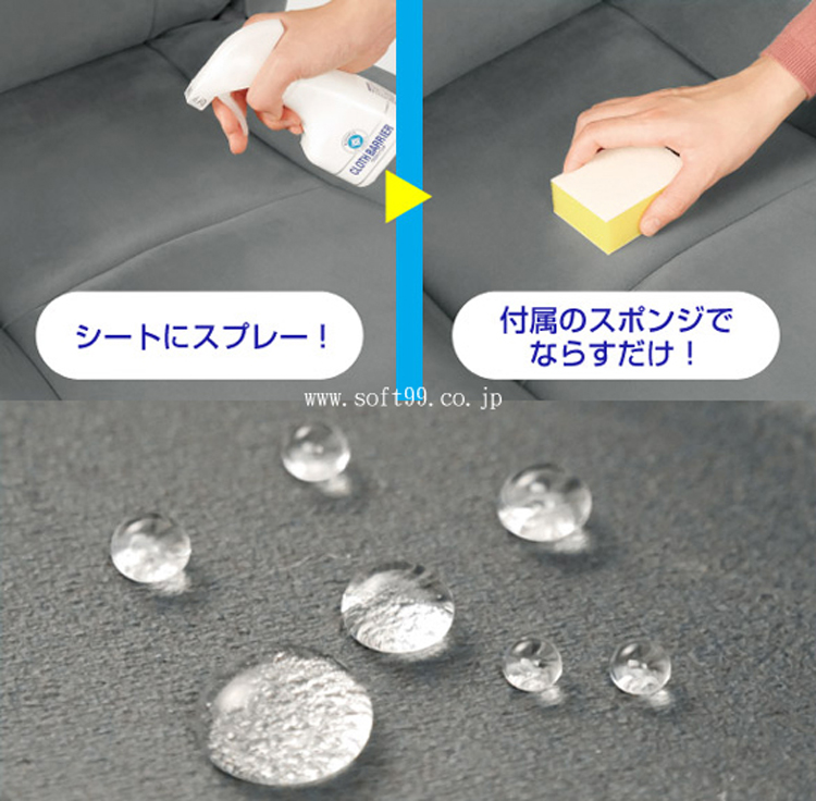 3.施工簡單。只需將液體噴灑於整個布面,等待乾燥。*對於纖維長的布面,請使用專用海綿擦拭。