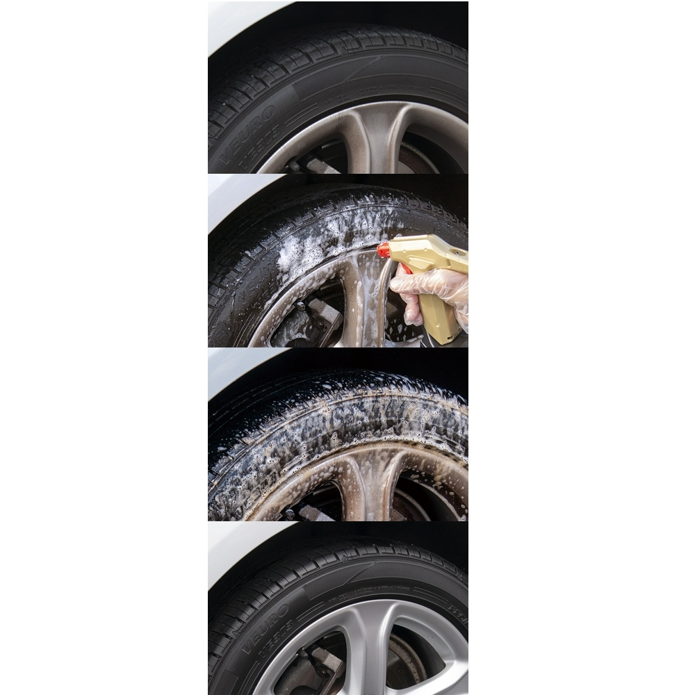 1.只需輕輕一噴,即可去除輪圈和輪胎的頑固污漬,不需洗兩次,以往產品輪圈與輪胎需分開各別洗淨,透過超浸透泡沫及柑橘油配方,一次解決頑強的鐵粉和油汙。