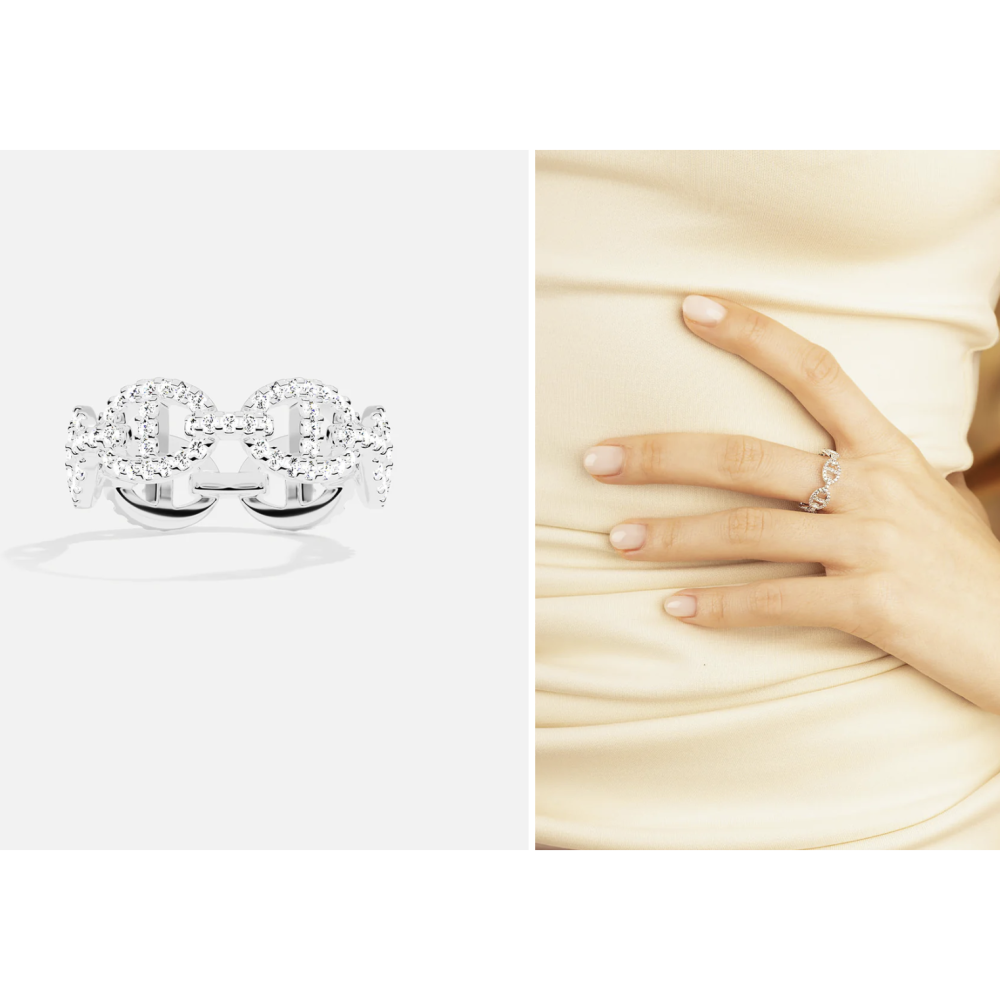 這款戒指采用 APM 玫瑰合金材質,表面鍍18K金,微鑲白色立方氧化锆。