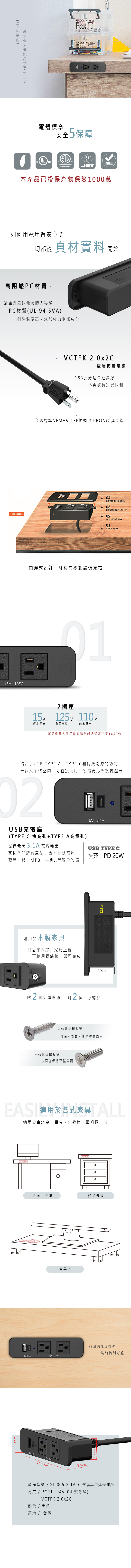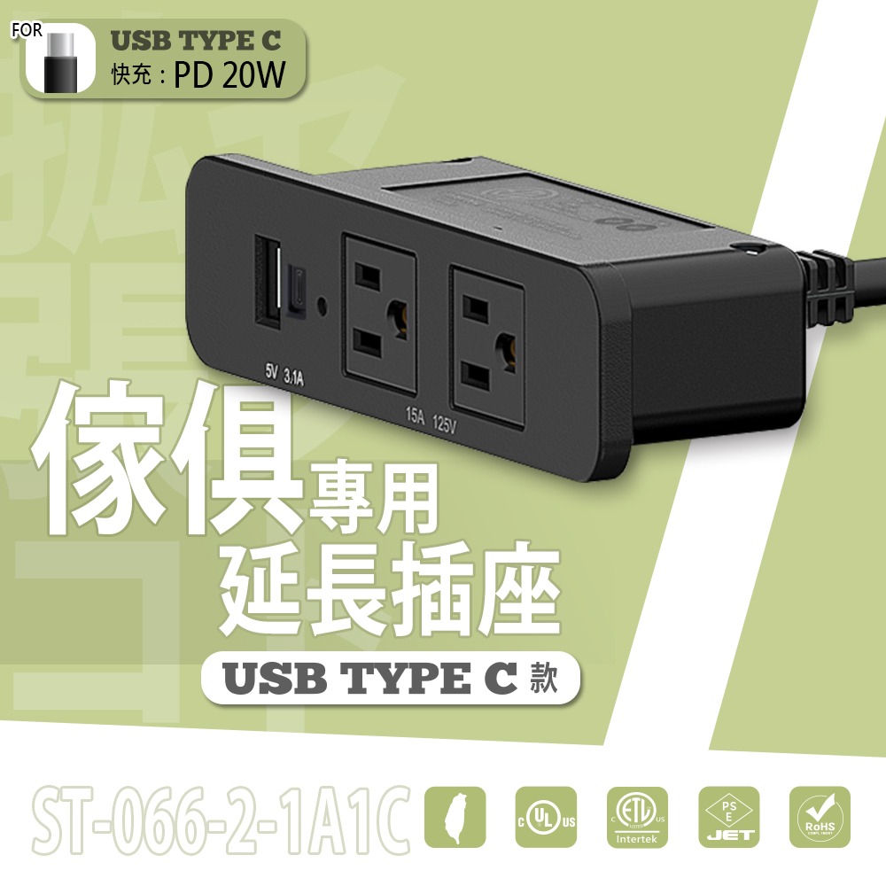 【dayneeds】ST-066-2-1A1C 傢俱專用延長插座 USB Type-C款