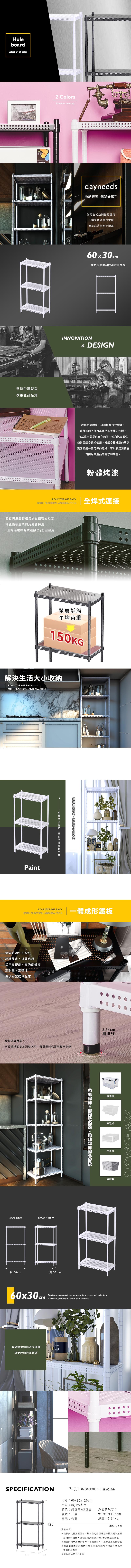【dayneeds】沖孔 60x30x120公分 三層烤漆架 兩色可選