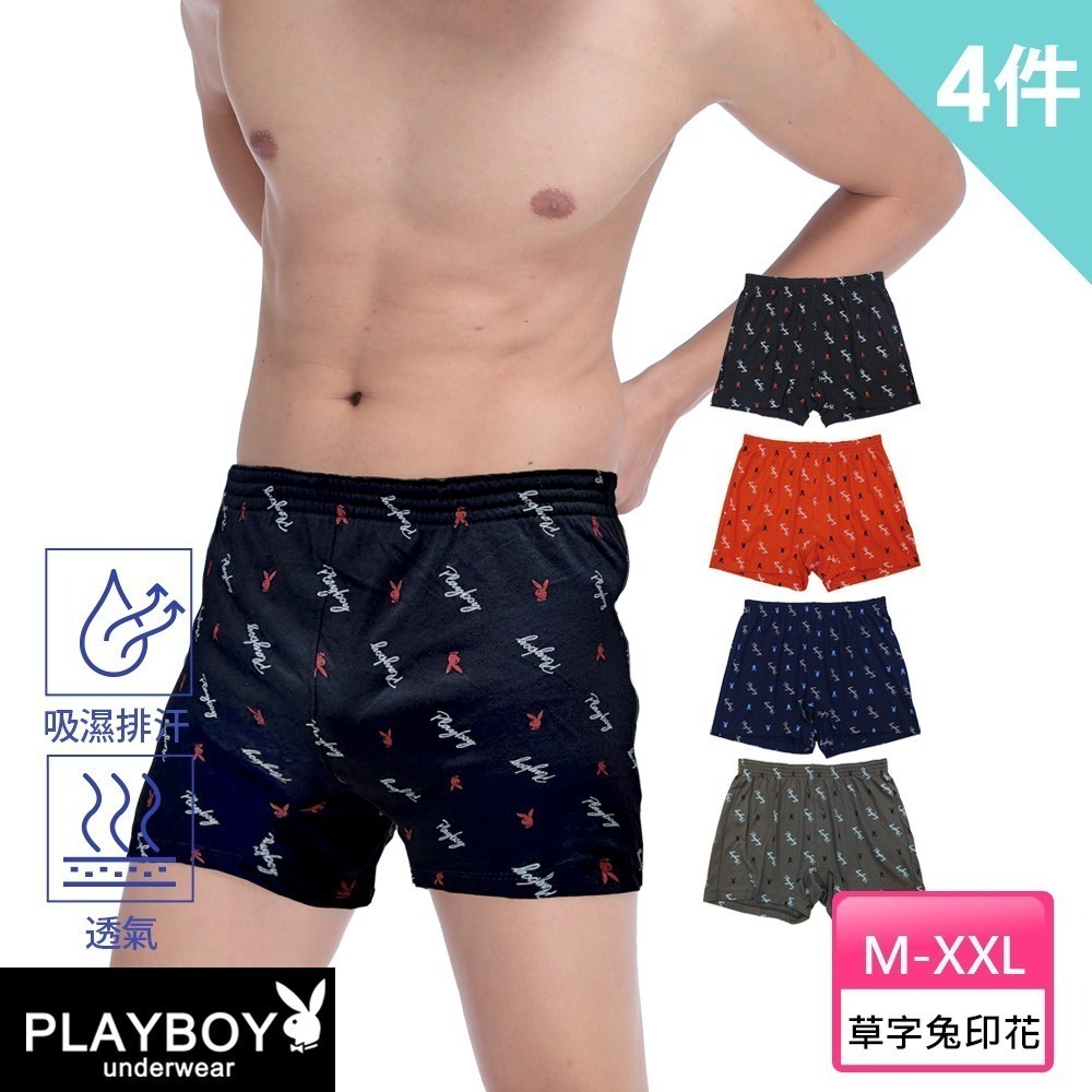 【PLAYBOY】草寫字兔印花透氣針織四角褲(超值4件組)