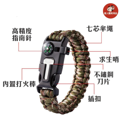 📌材質:POM塑膠插扣、鎂棒打火石、304刀片、亞克力指南針、滌綸七芯傘繩