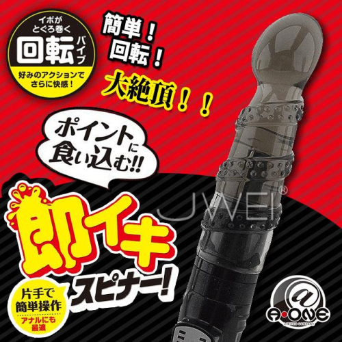 バイブのラバー全体がグルグル回転しながら、奥の奥まで刺激するバイブレーター! Gスポに食い込むような先端の丸いヘッドデザインと、根元部分に向かって太くなるボディです。サオ部分は、トルネード状に巻き付くように配置されたイボイボ突起がゴリゴリ高刺激を与えてくれます。 スピード調節・回転アクション切替、回転のリバースもワンプッシュと簡単に操作が可能。 子機のない一本型のバイブだから、奥で感じる人にオススメのバイブ。 電動機能を使わなくともディルド(こけし)としても十分楽しめる長さと太さも自慢です。