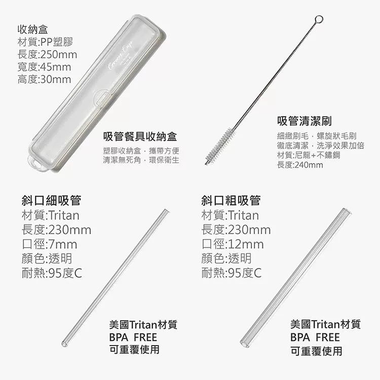 採用美國Tritan材質,附收納盒攜帶方便,附清潔刷可深入管內清潔好沖好洗。