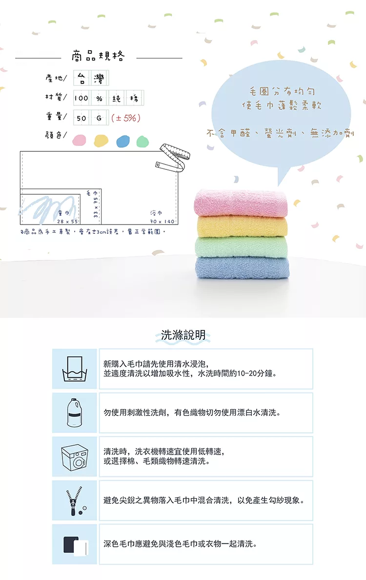 臺灣製造品質安心,100%純棉材質觸感柔細低棉絮,超可愛動物圖案,不論是大人還是小寶貝都可以使用,使用起來超細緻,輕薄快乾溫和去除污垢。